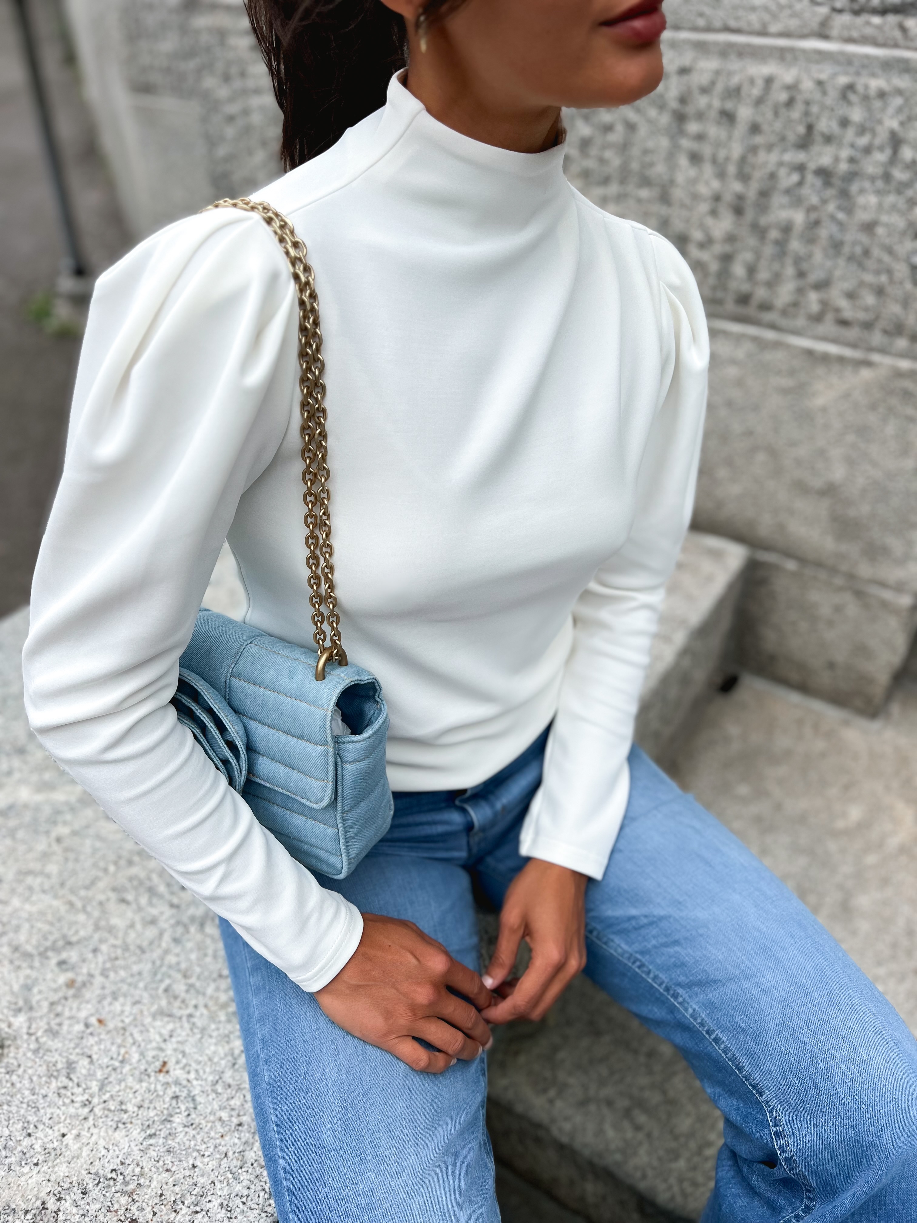 «Fenja t-neck top» fra Selected Femme. Nydelig høyhalset topp med lang erm med puffskuldre. Normal i størrelsen.