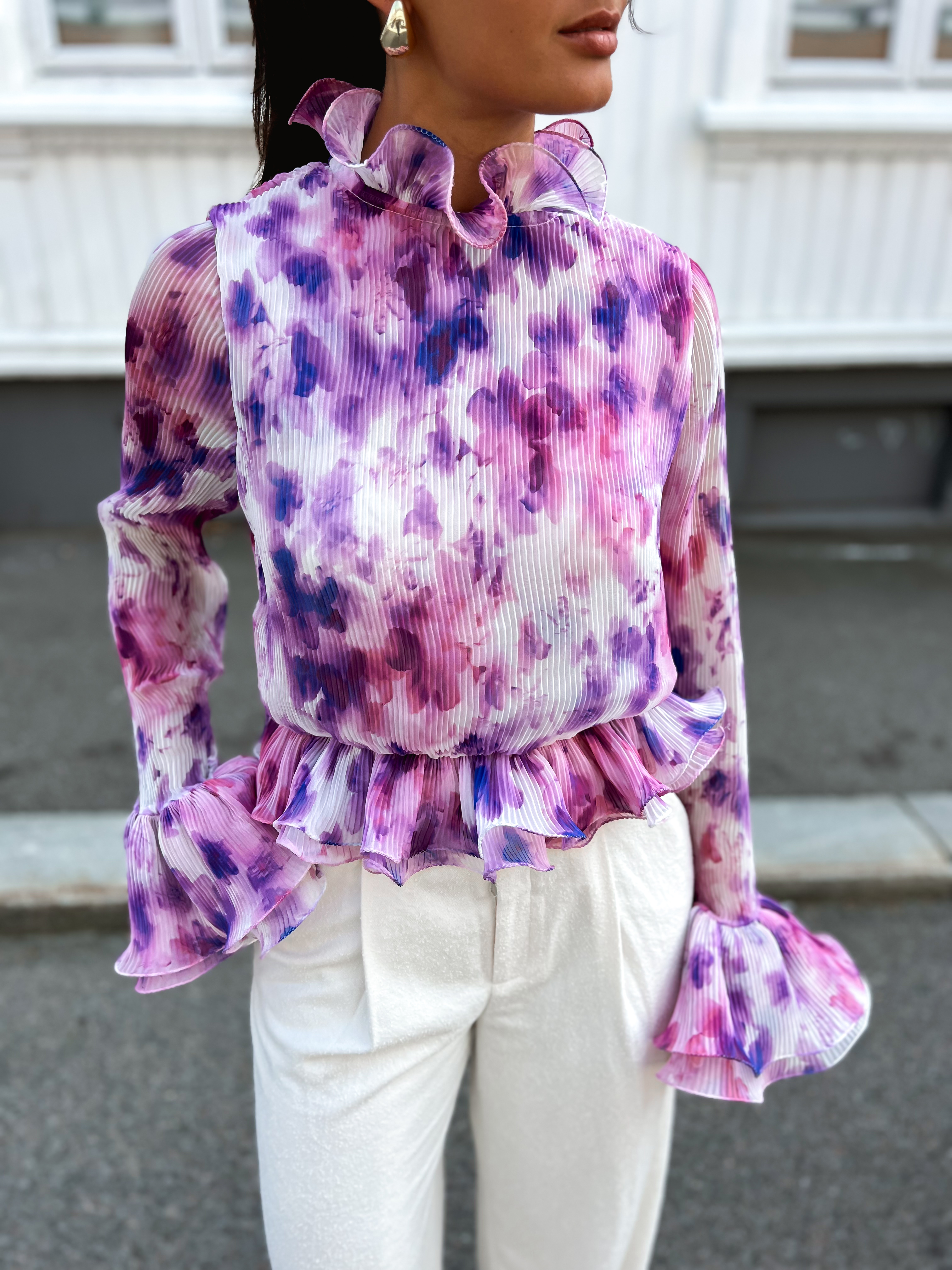 «Chiffon ruffle top» fra Rotate. Lekker top i nydelig print. Toppen har rund hals og lang erm. Chiffon ruffle top har lekre frynse detaljer som gir det lille ekstra!