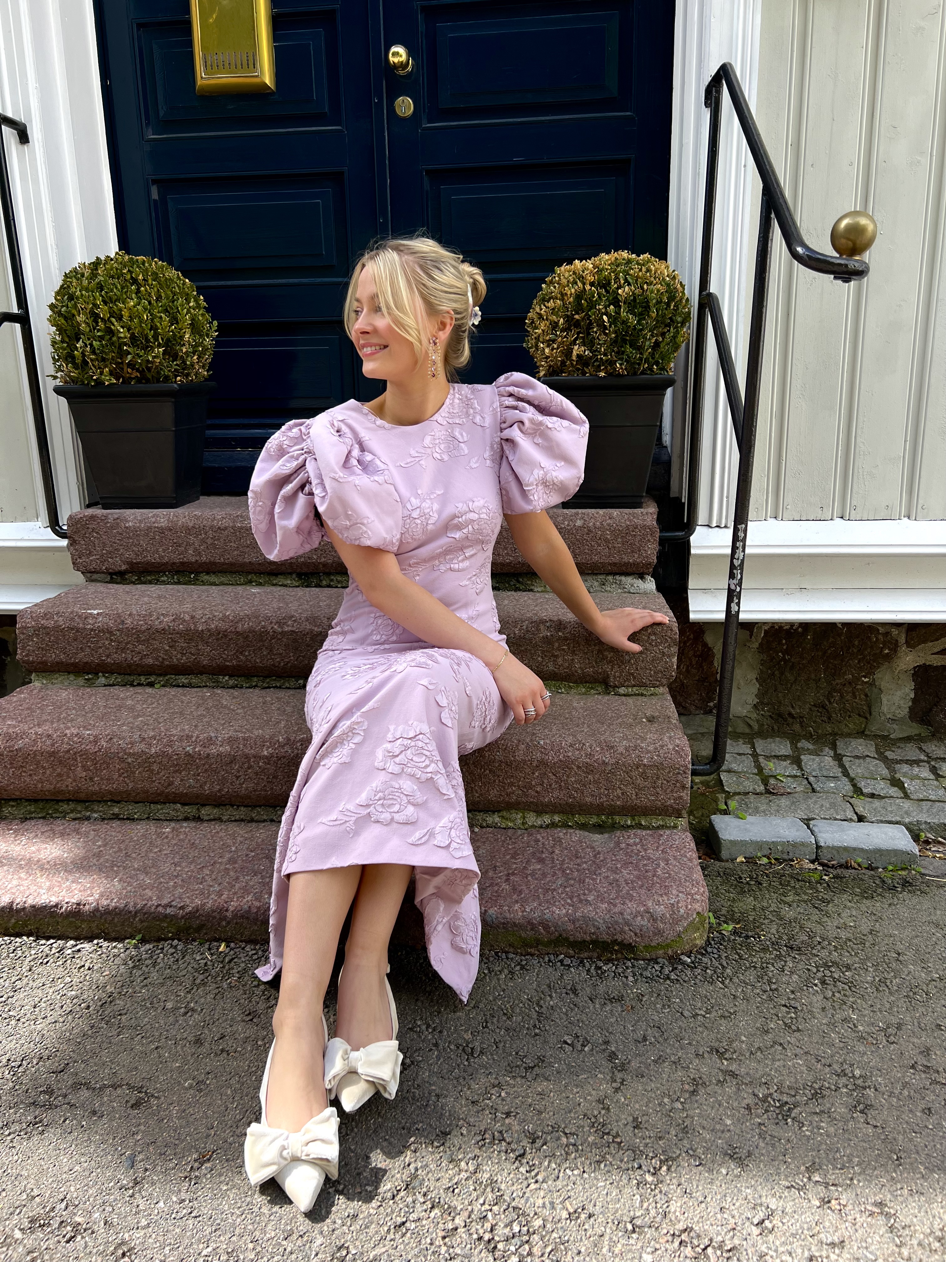 «Jaquard midi dress» fra Rotate. Kjolen har en lang, elegant silhuett med store, dramatiske puffy ermer og rund hals. Lukkes med skjult glidelås bak. Kjolen er i midi-lengde og splitt bak.