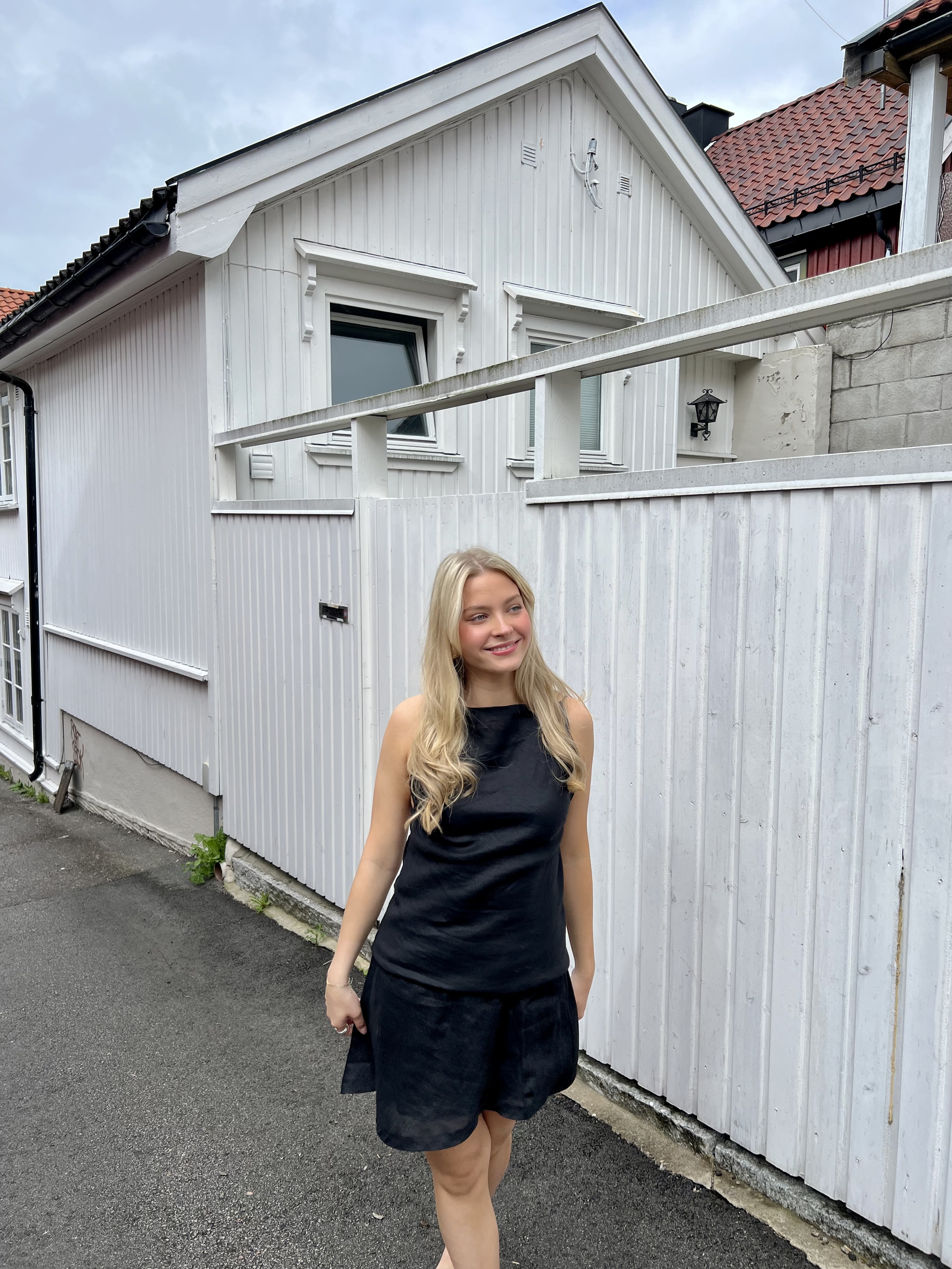 «Antibes top» fra FAITHFULL THE BRAND. En ermeløs topp i 100 % European Flax® lin med høy firkantet hals og skjev snitt. Den har en lav rygg med tynne stropper som krysser hverandre og er justerbare å knyte. Style med en klassisk bukse for en avslappet sommerlook.