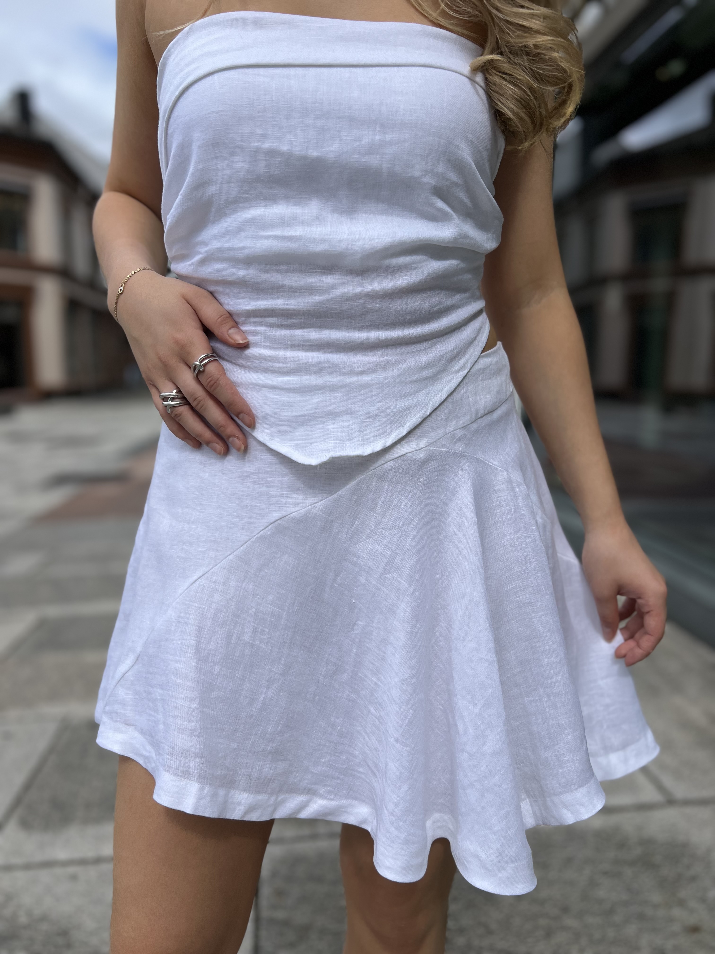 «Antibes asymmentrical mini skirt» fra FAITHFULL THE BRAND. Et mellomhøyt miniskjørt med en litt utsvingt asymmetrisk kant. Laget av European Flax® lin, sitter den komfortabelt på hoftene før den faller inn i et mykt skjørt med avslappede bevegelser.