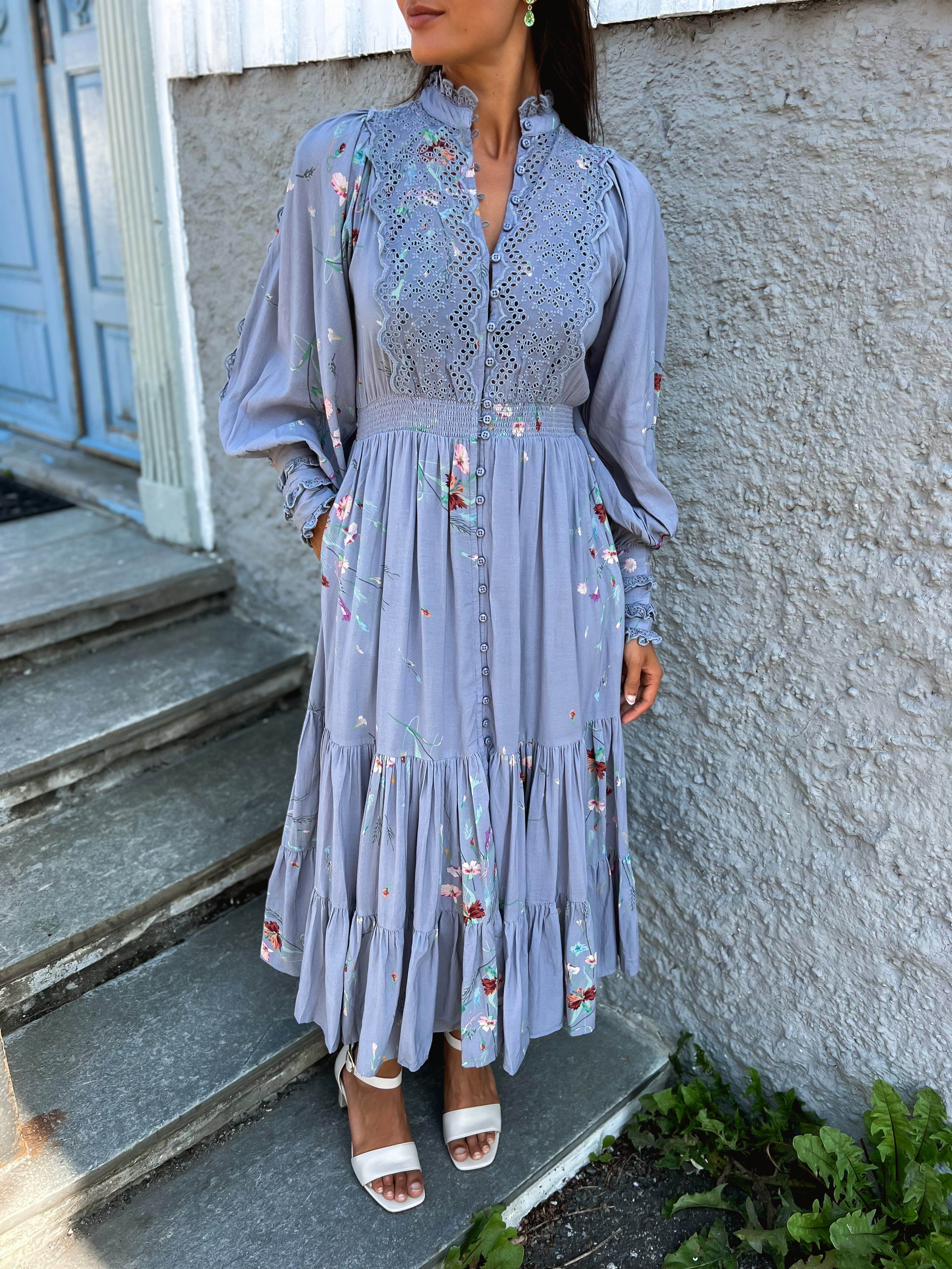"Cotton Slub Midi Dress" fra byTiMo. En nydelig midikjole fra byTiMo. Cotton Slub Midi Dress er kuttet i byTiMos lette og myke bomull- og viskoseblanding med slubdetaljer i stoffet. Den har en minilengde og definert, smocket midje. Kjolen har oversizede, vintage-inspirerte, korte ermer og er satt inn med broderie anglaise detaljer på brystet, ermene, mansjettene og halsen. Cotton Slub Midi Dress har et elegant midiskjørt med volum, knappelukking i front og knytebelte i livet.