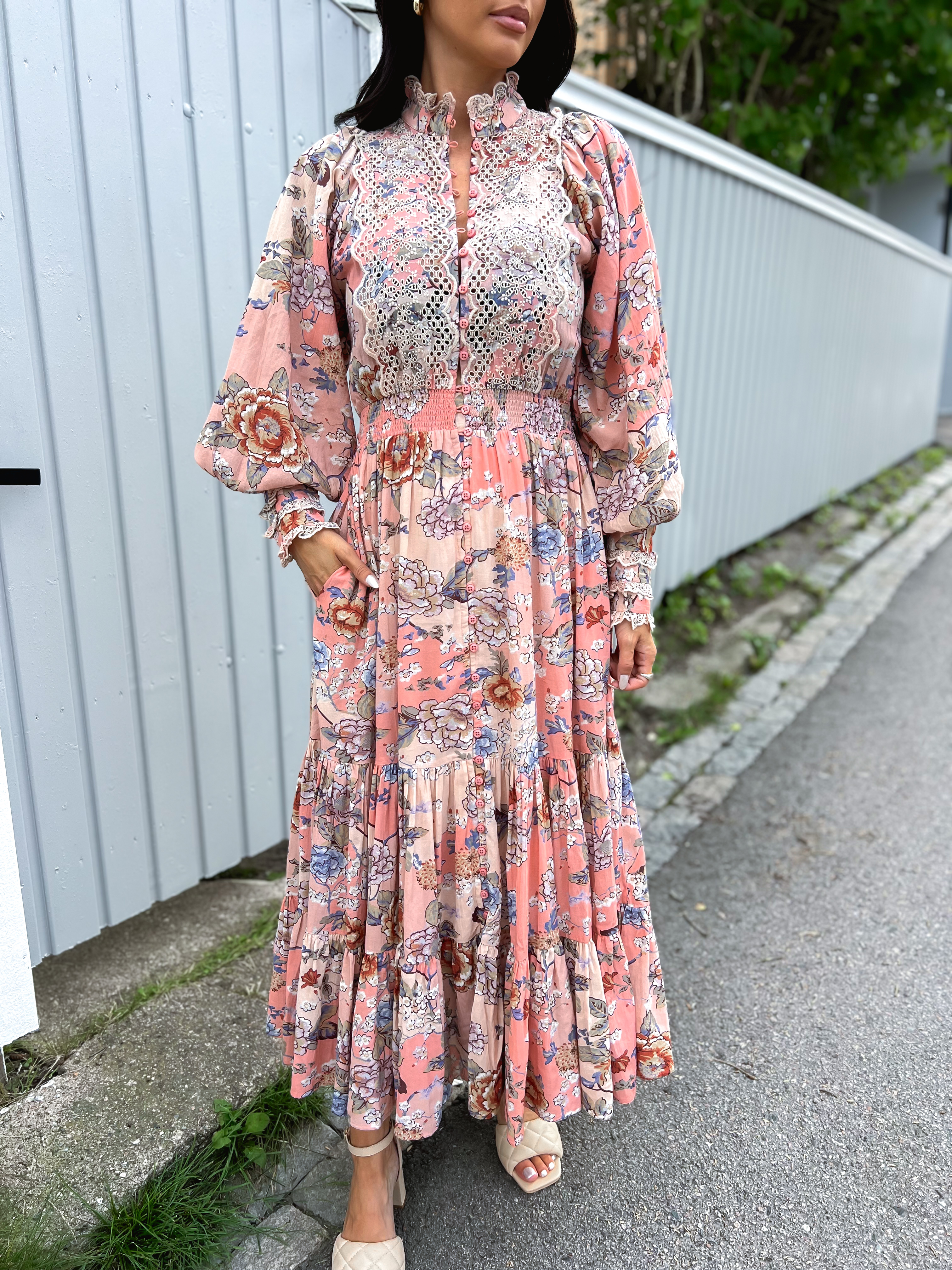 "Cotton Slub Midi Dress" fra byTiMo. En nydelig midikjole fra byTiMo. Cotton Slub Midi Dress er kuttet i byTiMos lette og myke bomull- og viskoseblanding med slubdetaljer i stoffet. Den har en minilengde og definert, smocket midje. Kjolen har oversizede, vintage-inspirerte, korte ermer og er satt inn med broderie anglaise detaljer på brystet, ermene, mansjettene og halsen. Cotton Slub Midi Dress har et elegant midiskjørt med volum, knappelukking i front og knytebelte i livet.