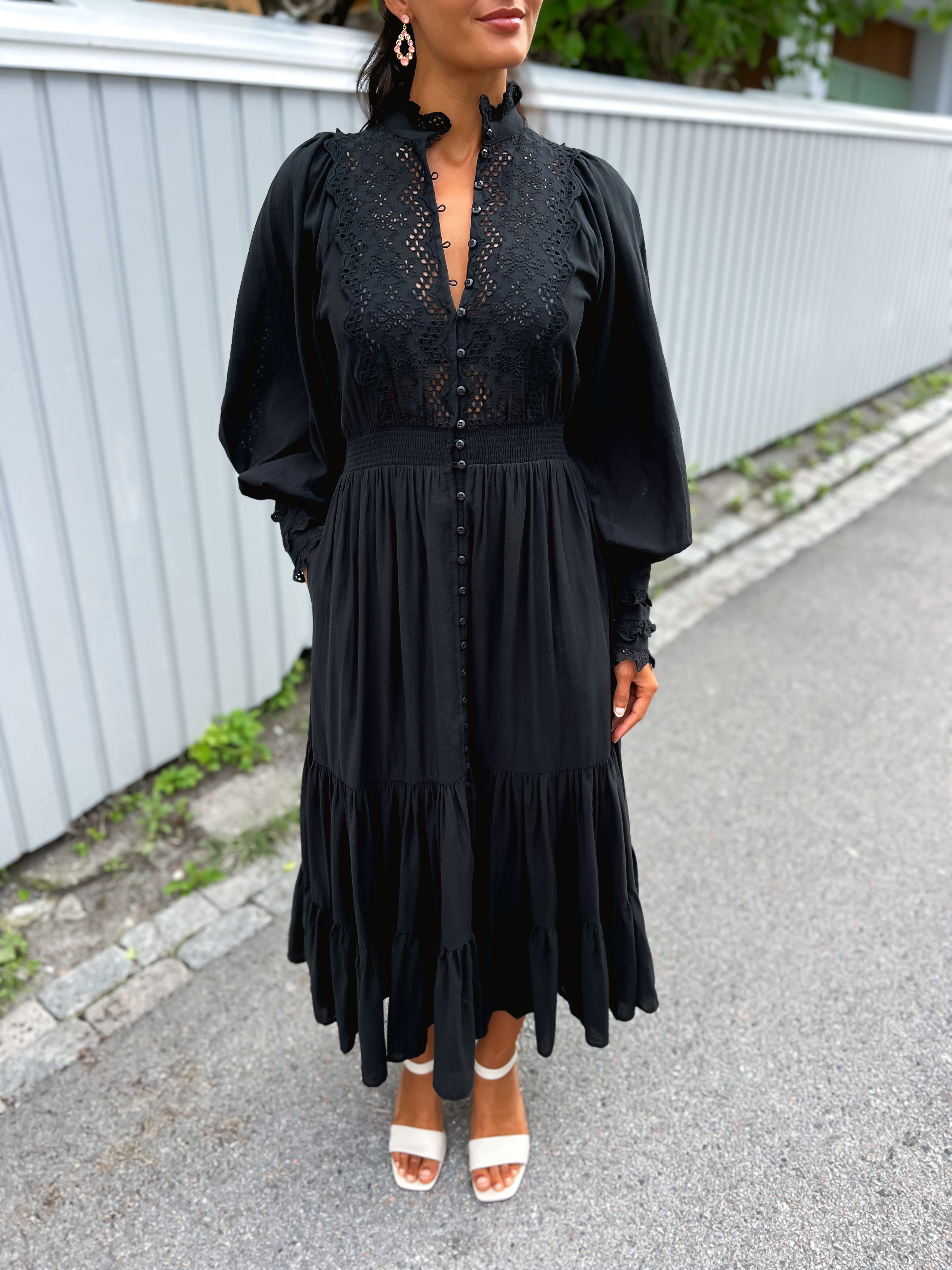 "Cotton Slub Midi Dress" fra byTiMo. En nydelig midikjole fra byTiMo. Cotton Slub Midi Dress er kuttet i byTiMos lette og myke bomull- og viskoseblanding med slubdetaljer i stoffet. Den har en minilengde og definert, smocket midje. Kjolen har oversizede, vintage-inspirerte, korte ermer og er satt inn med broderie anglaise detaljer på brystet, ermene, mansjettene og halsen. Cotton Slub Midi Dress har et elegant midiskjørt med volum, knappelukking i front og knytebelte i livet.