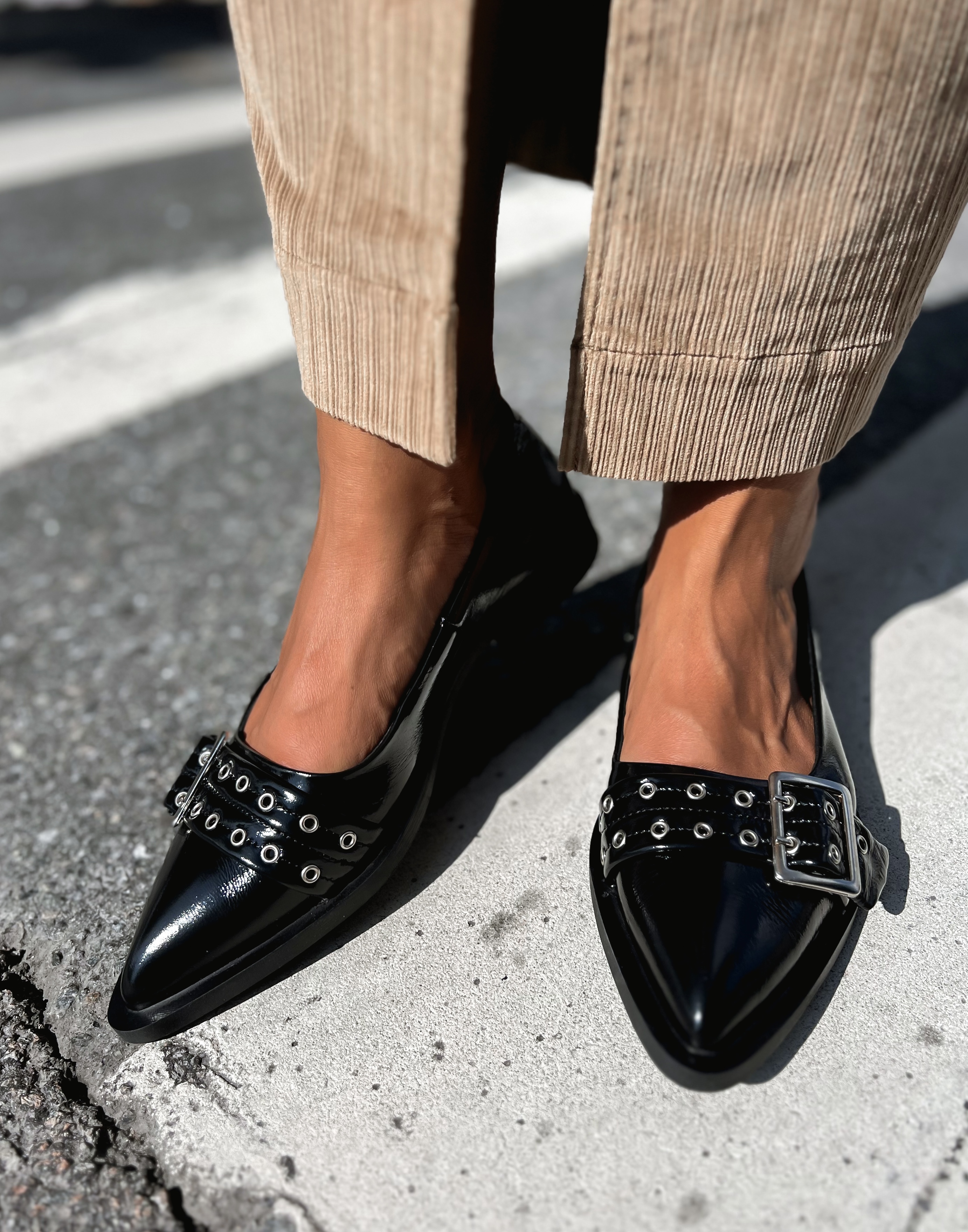 «Saso low» fra Pavement. Rålekre ballerinasko i lakk. Vi er ikke ferdig med ballerinasko - trenden er like stor og vi elsker det! Saso Low har spiss tå med en cool beltedetalj foran. Style skoene med et par baggy jeans eller en søt kjole.