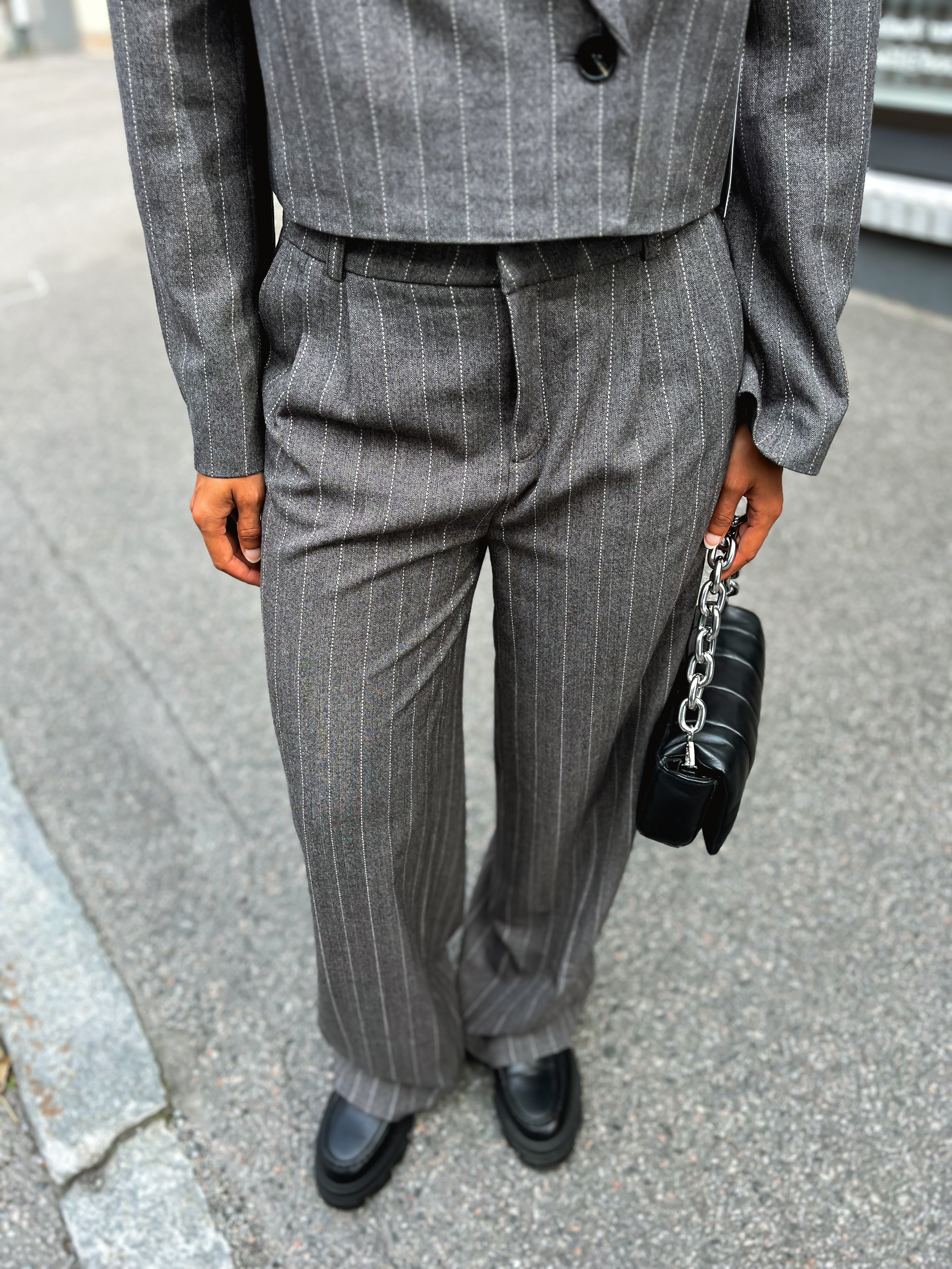 "Henley Trousers" fra Twist& tango er lekre grå pinstripede bukser fra Twist&tango. De har et bredt ben-design, doble folder, sidelommer og passpolerte lommer bak. Perfekt for å oppnå et sofistikert og stilfullt utseende på jobb.