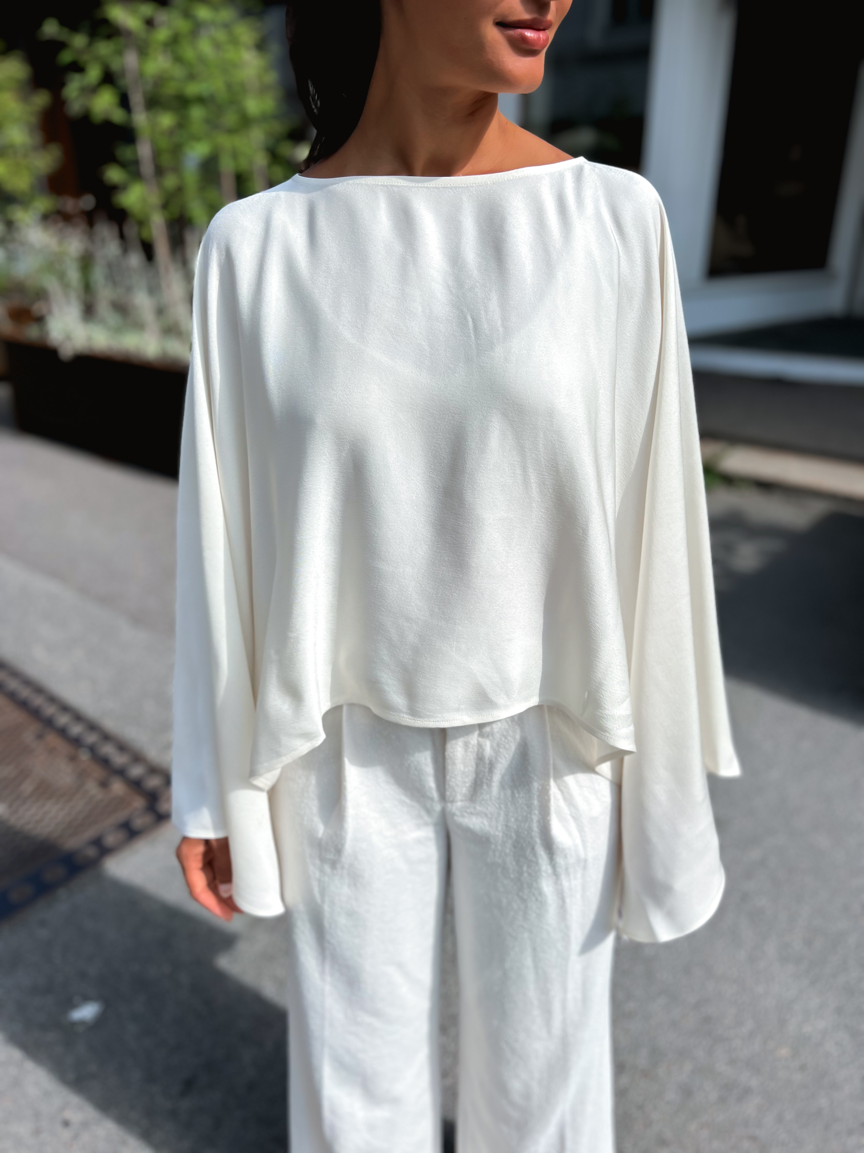 "Klasia Blouse" fra Twist & tango er et luksuriøst tillegg til garderoben din. Laget av en halvblank satin med løs passform og vide ermer, pyntet med en nøkkelhullsåpning og knappelukking i halsen.