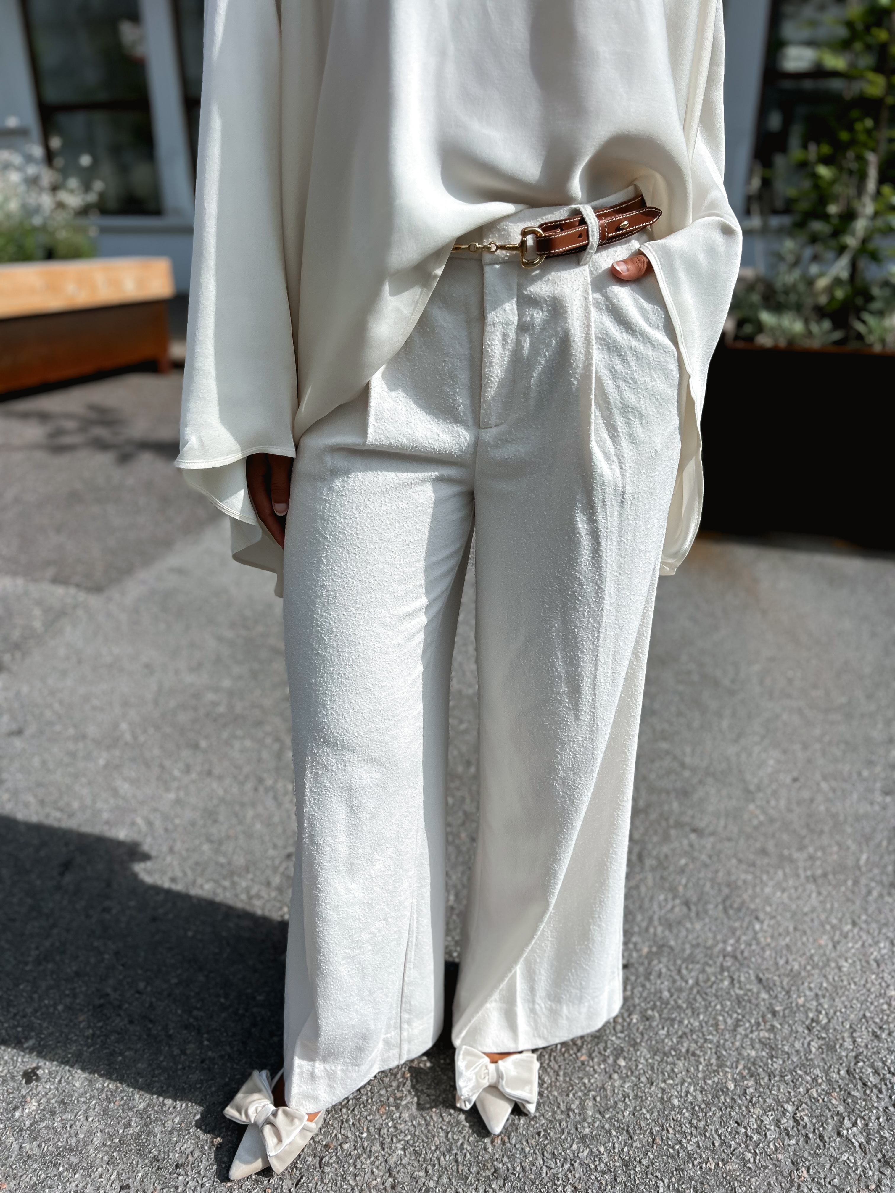 Laget av neppet stoff, de har en flatterende høy midje, vide ben, folder og skrå sidelommer foran samt passpolerte lommer bak.
