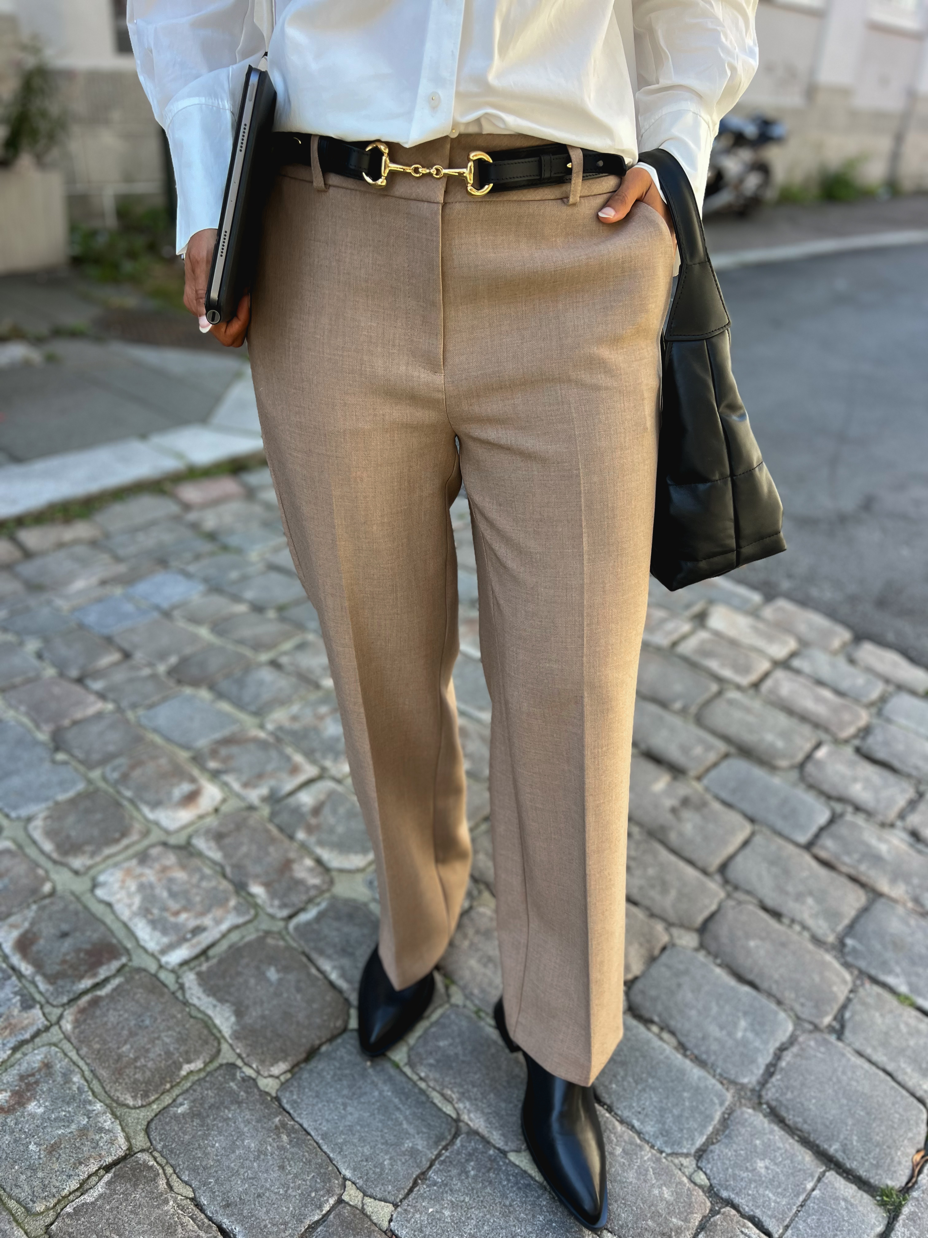 "Rita wide pant" fra Selected Femme er en klassisk sort dressbukse som passer til alt. Kan pyntes med en lekker bluse eller like fint med en strikkegenser. Den sitter over rumpe og lår, mens den er løs i beina. Buksen har to lommer foran og har beltestropper.