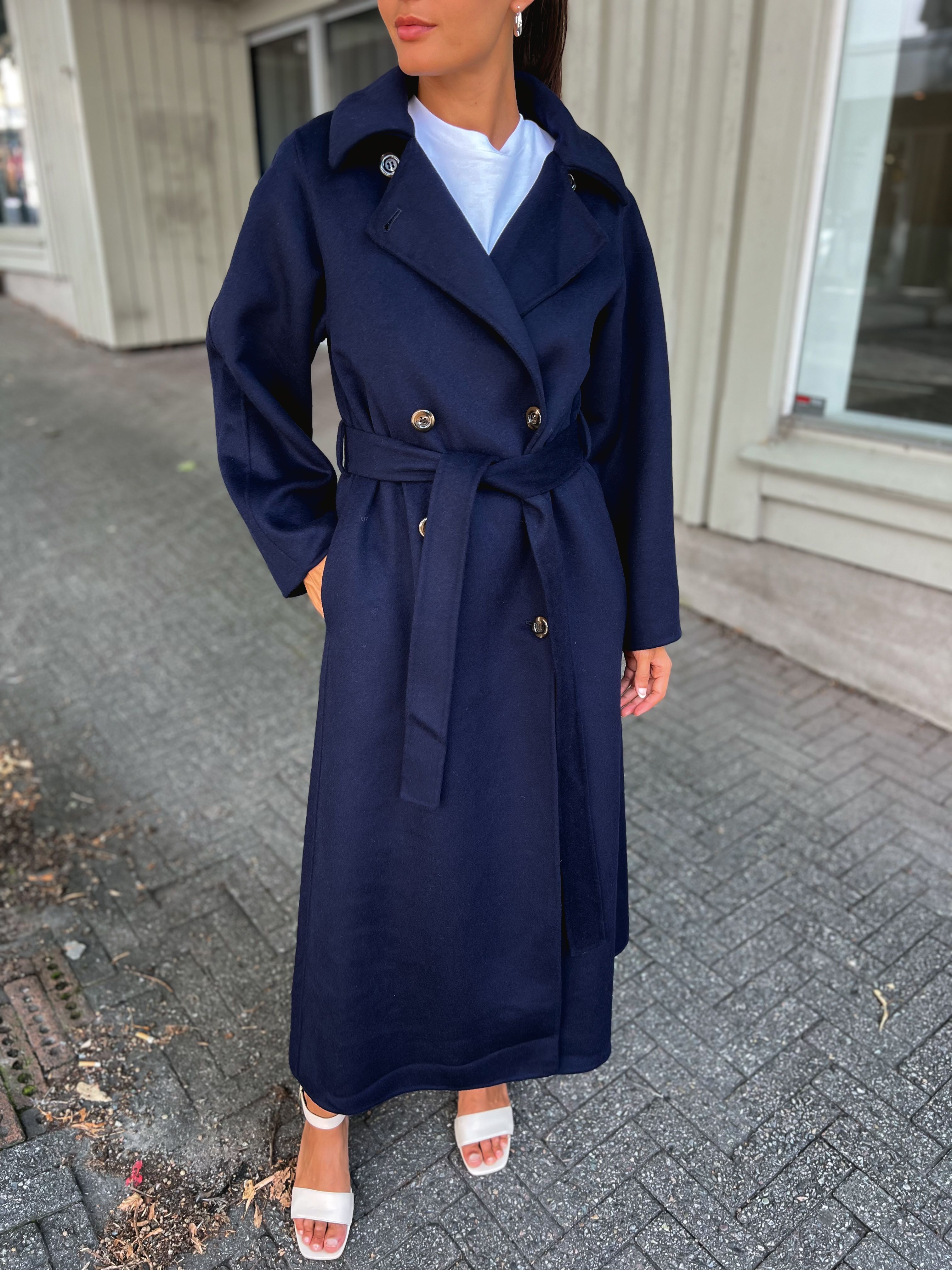 «Tailored belted coat» fra byTiMo er kuttet i elegante, varme og veldig myke ullblanding. Kåpen har maxi lengde, avslappet passform, klassisk krage og har to knapperader på hver side. Kåpen kommer med et løst, matchende knytebånd.