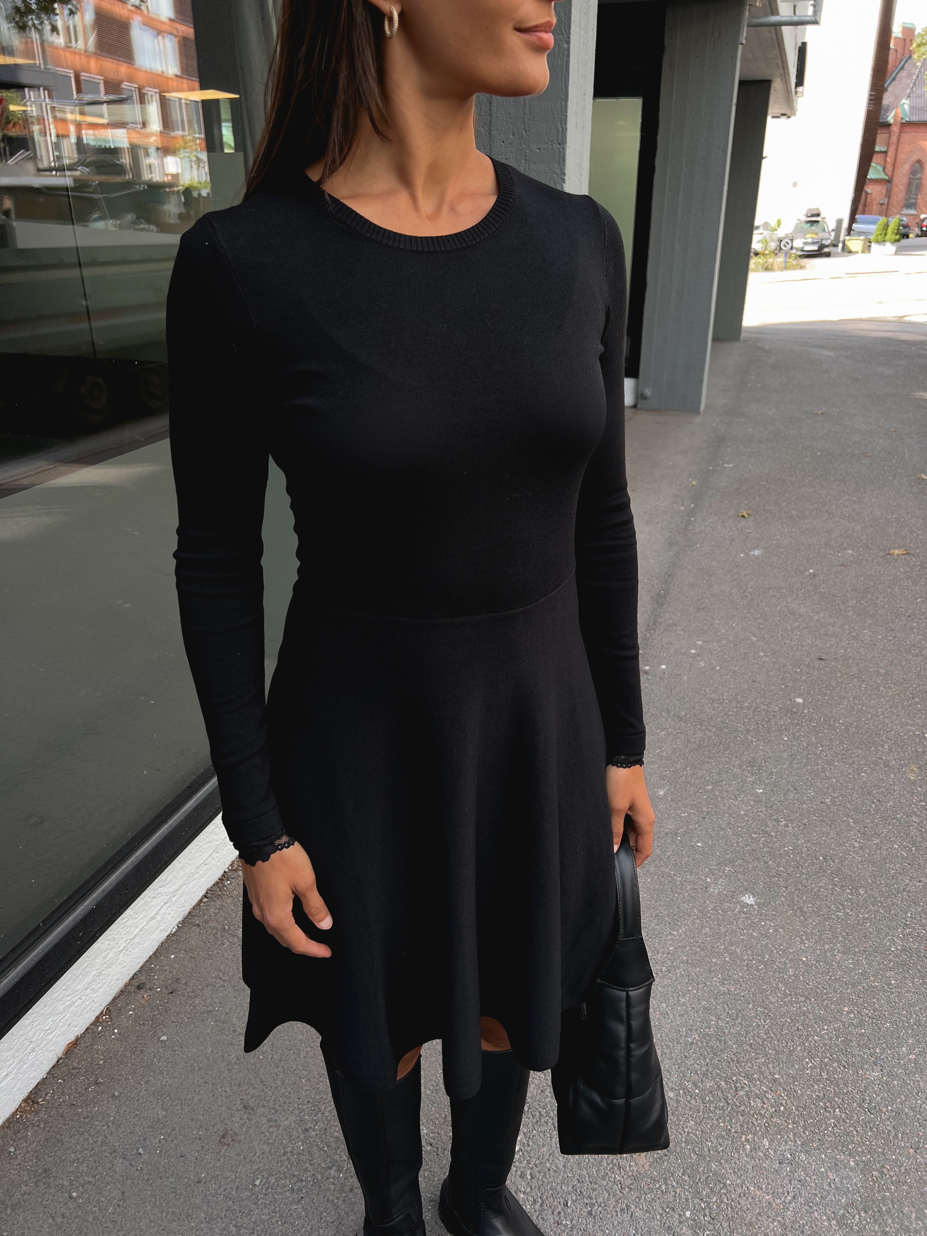 «Becco knit dress» fra YAS er en klassisk sort strikke-kjole i sort i deilig stretch. Den har rund hals og lange smale ermer. A-fasong på skjørtet og har nydelig blonde-detaljer nederst på ermene.