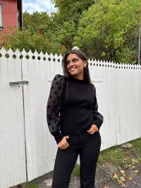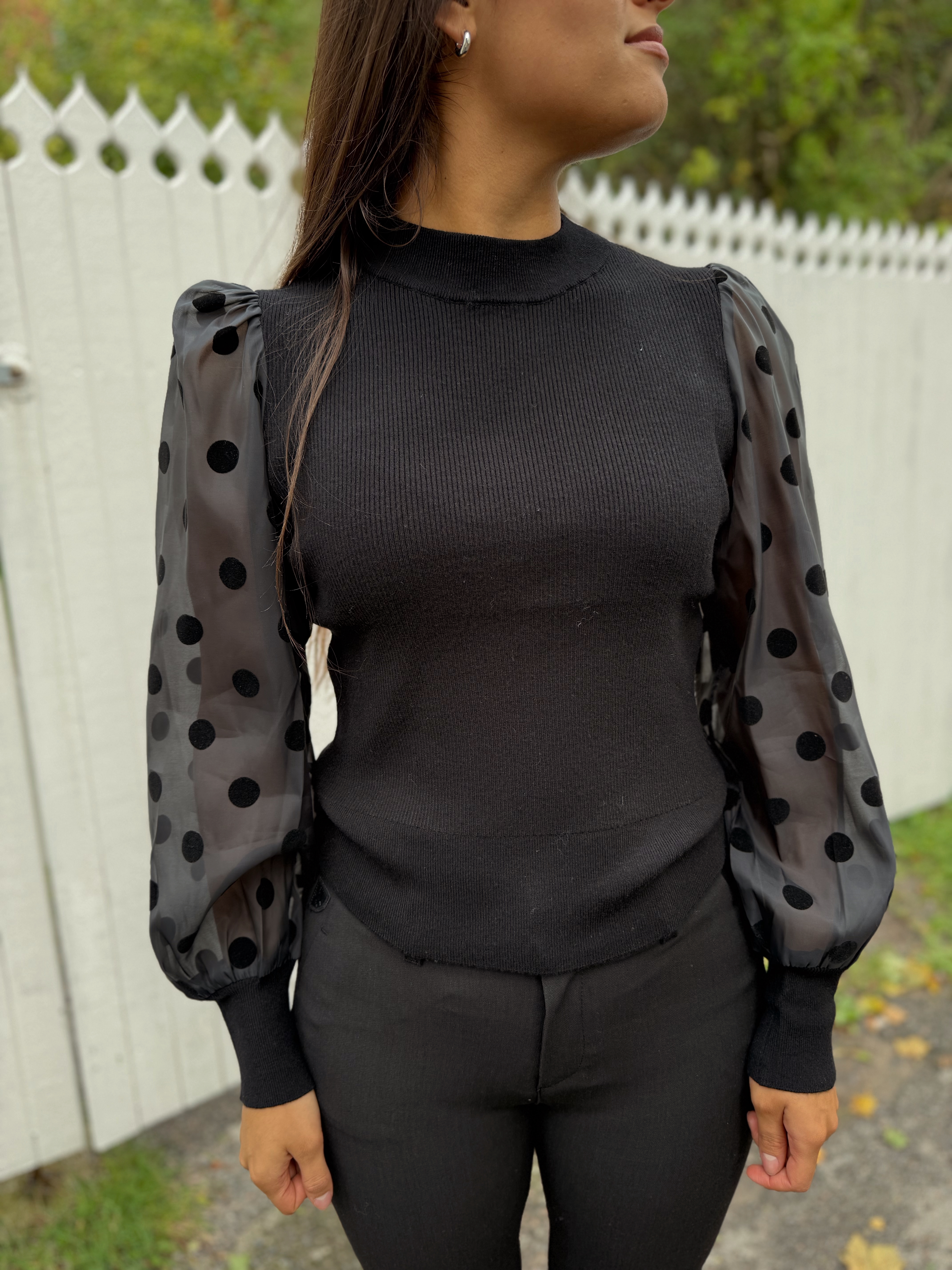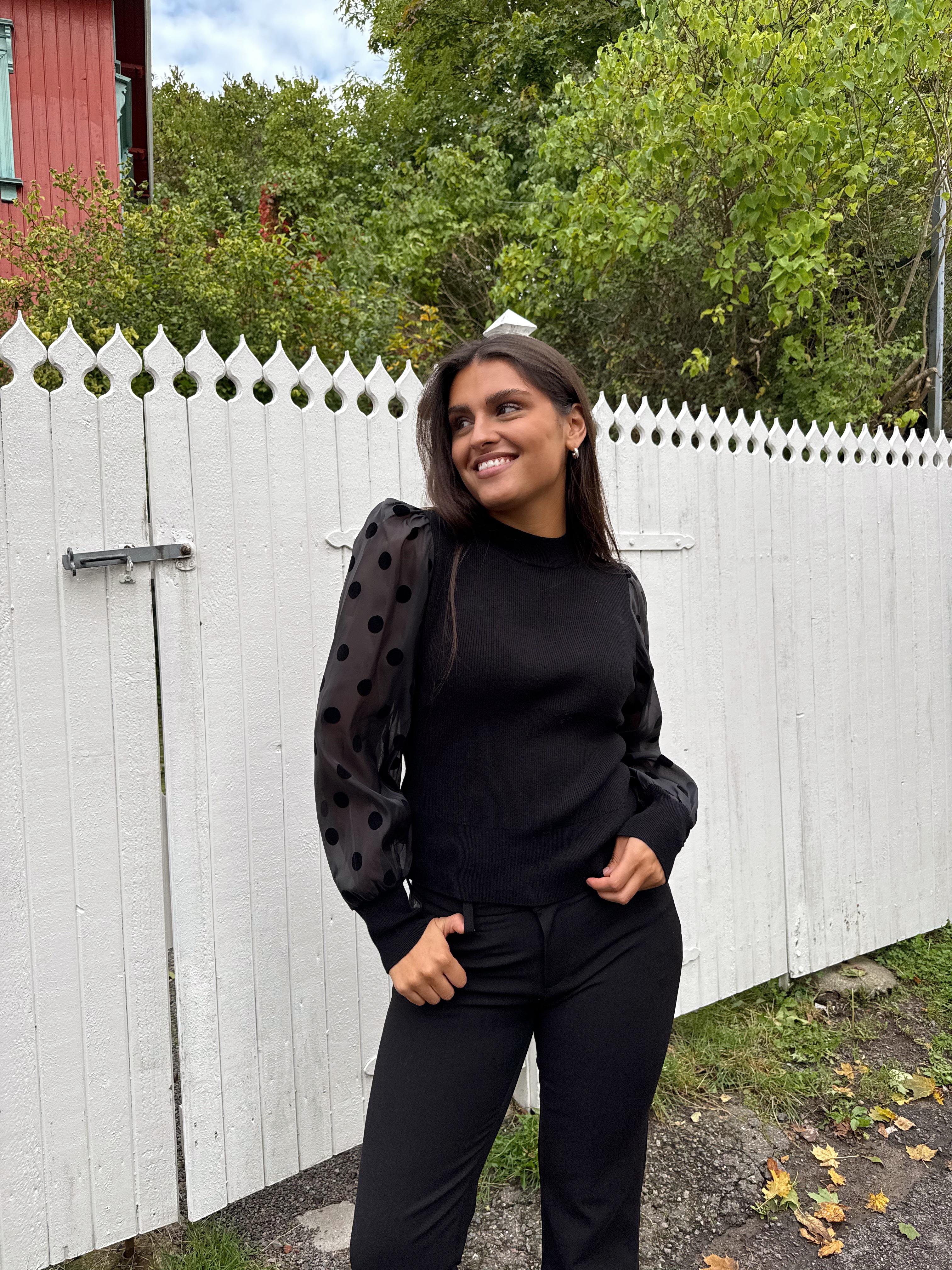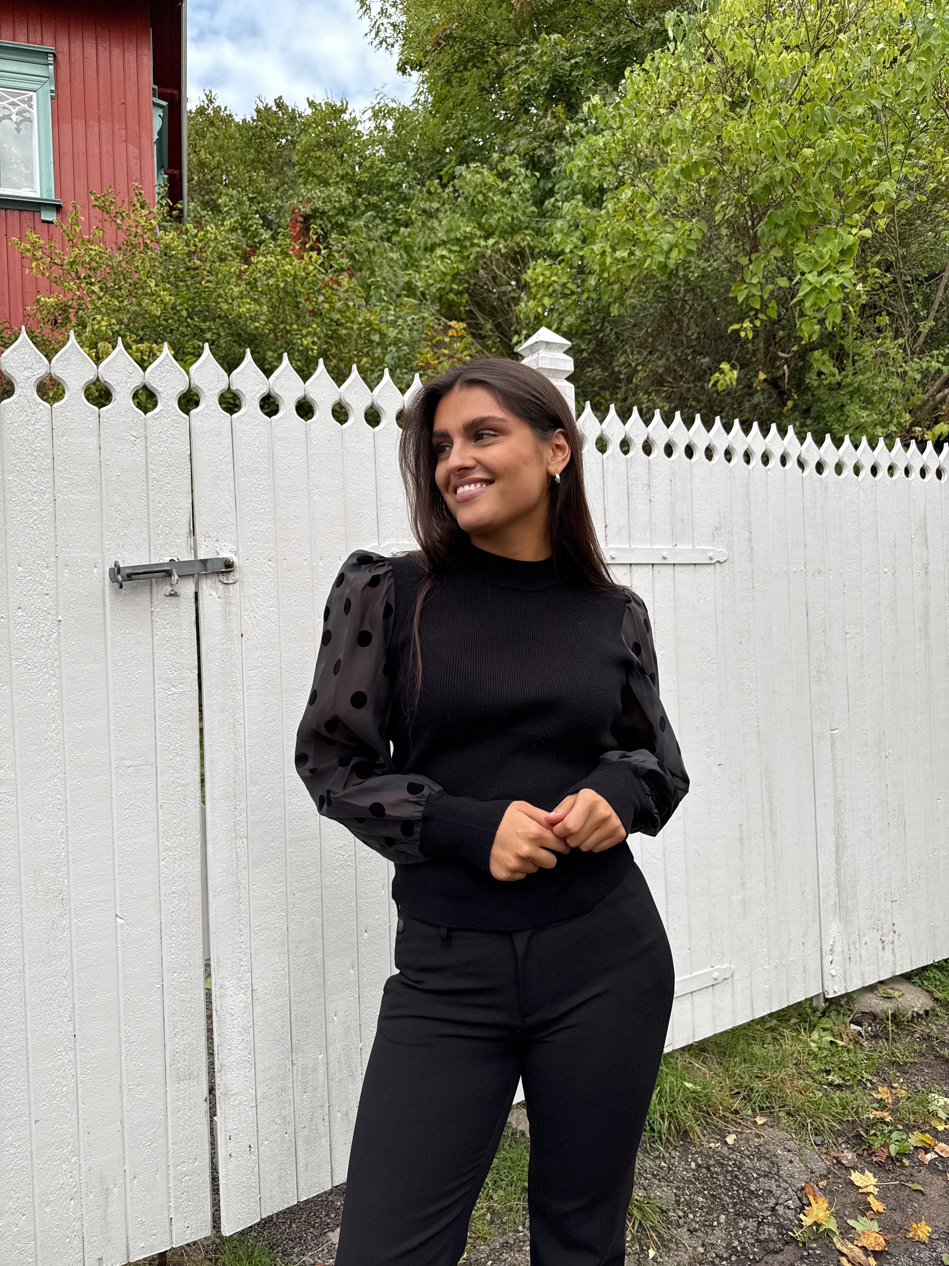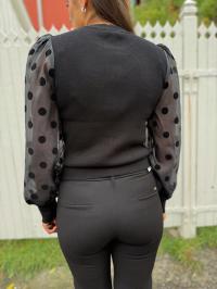 «Dotme knit pullover» fra YAS er en sort tettsittende strikkegenser med rund hals. Den har l store ermer i gjennomsiktig stoff med runde sorte «dotter». Ribbet strikk.