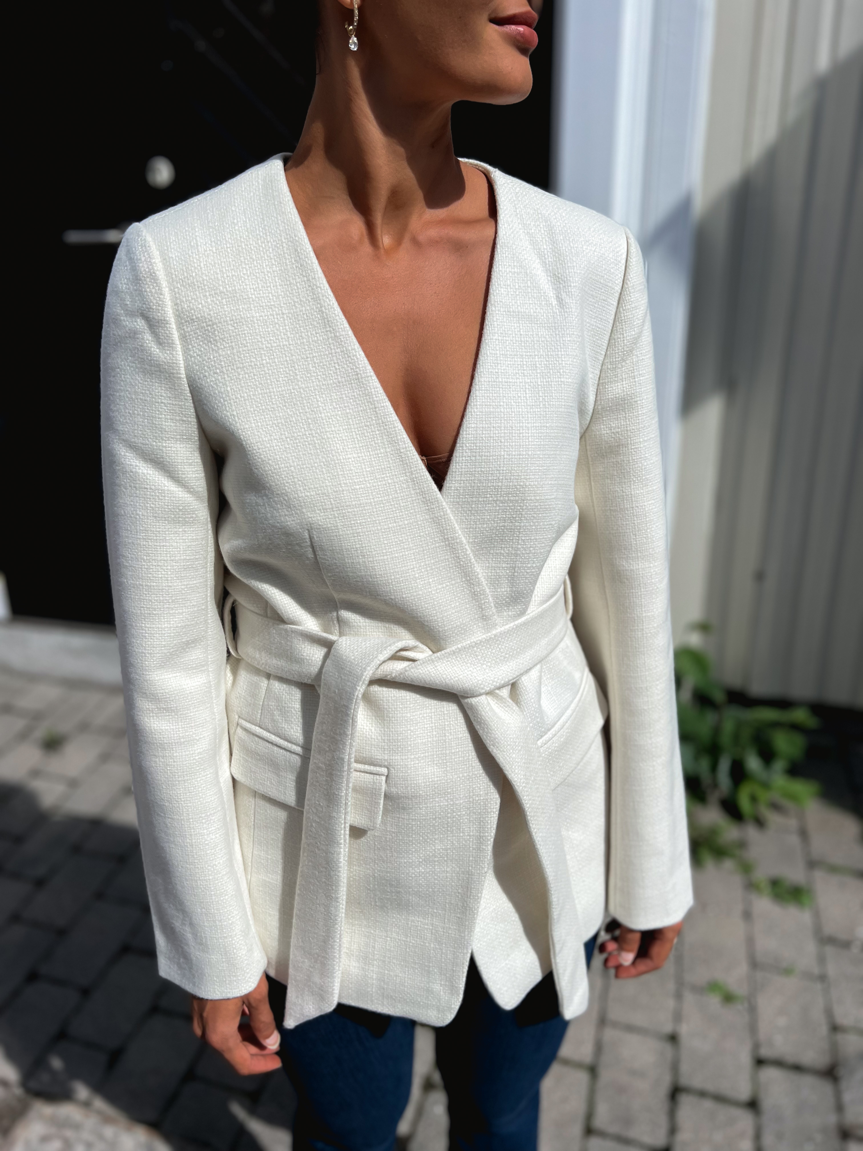 «Belli blazer» fra YAS. Klassisk og elegant hvit blazer med belte i midjen. Blazeren har v-hals og lang erm.