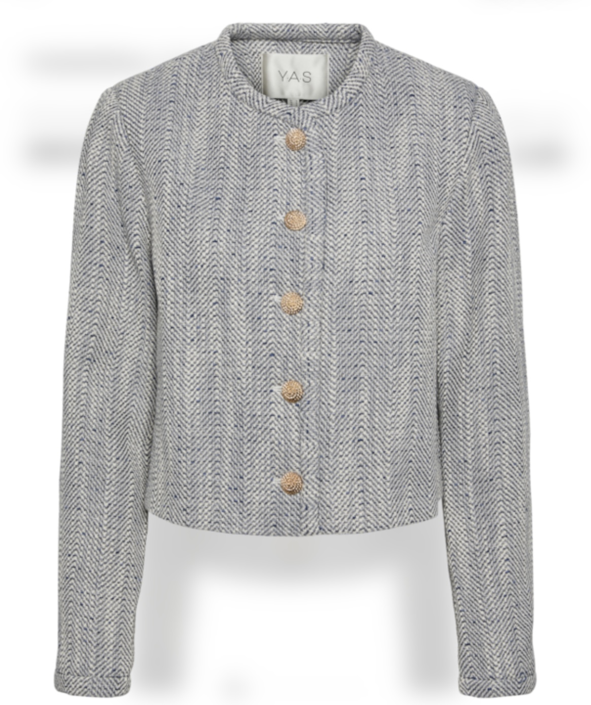 «Norali jacket» fra YAS. Elegant jakke som kombinerer et klassisk design med stilige detaljer. Den har en avslappet passform med lange ermer og en rund hals. Den har dekorative gullknapper foran. Den kan enkelt styles med jeans for en avslappet look, eller med en skjørt og bluse for en mer formell kveld ute.