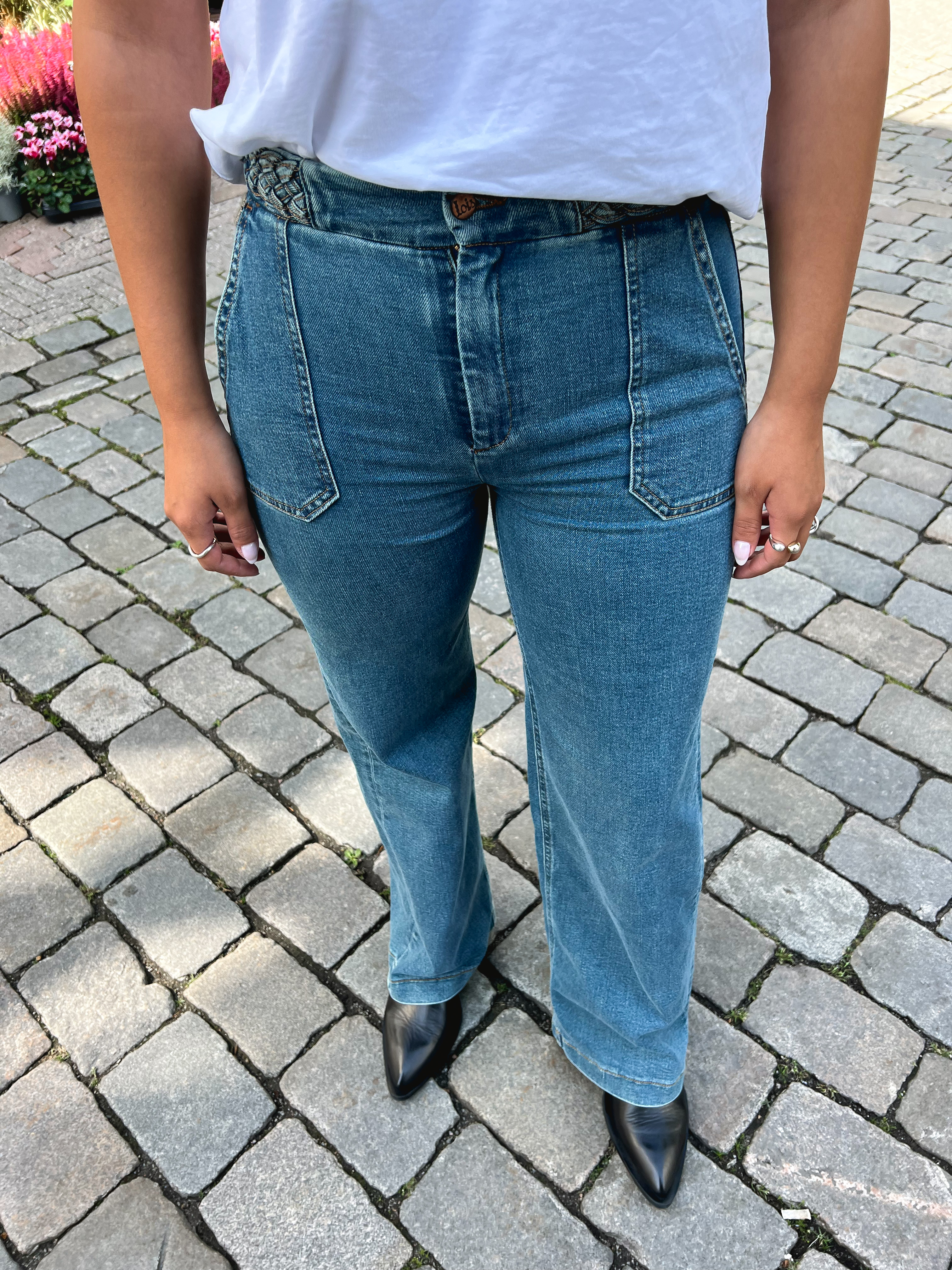 «Sanne the green stone» fra Lois. Sanne er en flettede slengbukser med høy midje og rette ben. Litt mindre stretch.