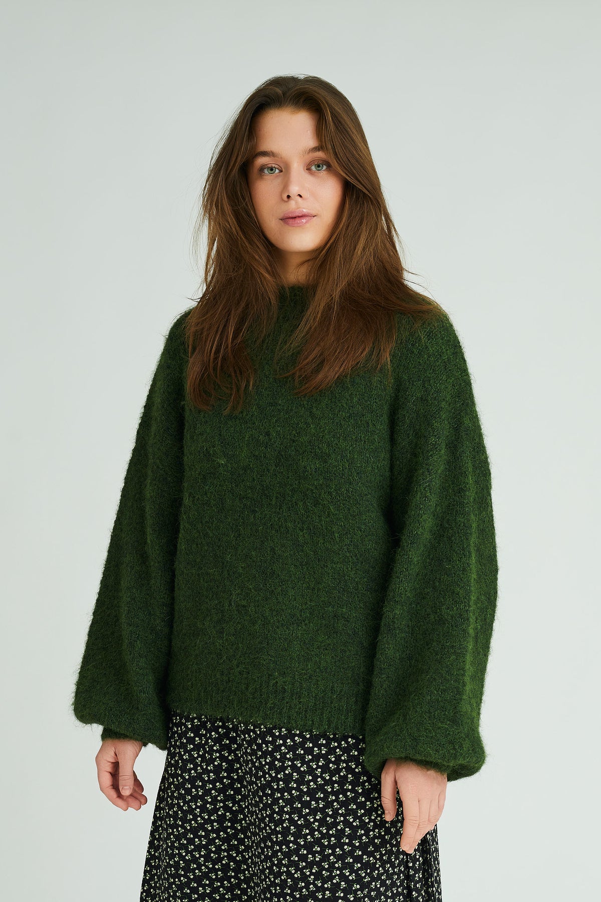 «Patrisia solid knit pullover» fra A-View. Nydelig oversized strikkegenser i nydelig grønnfarge. Genseren har rund hals og store ermer.