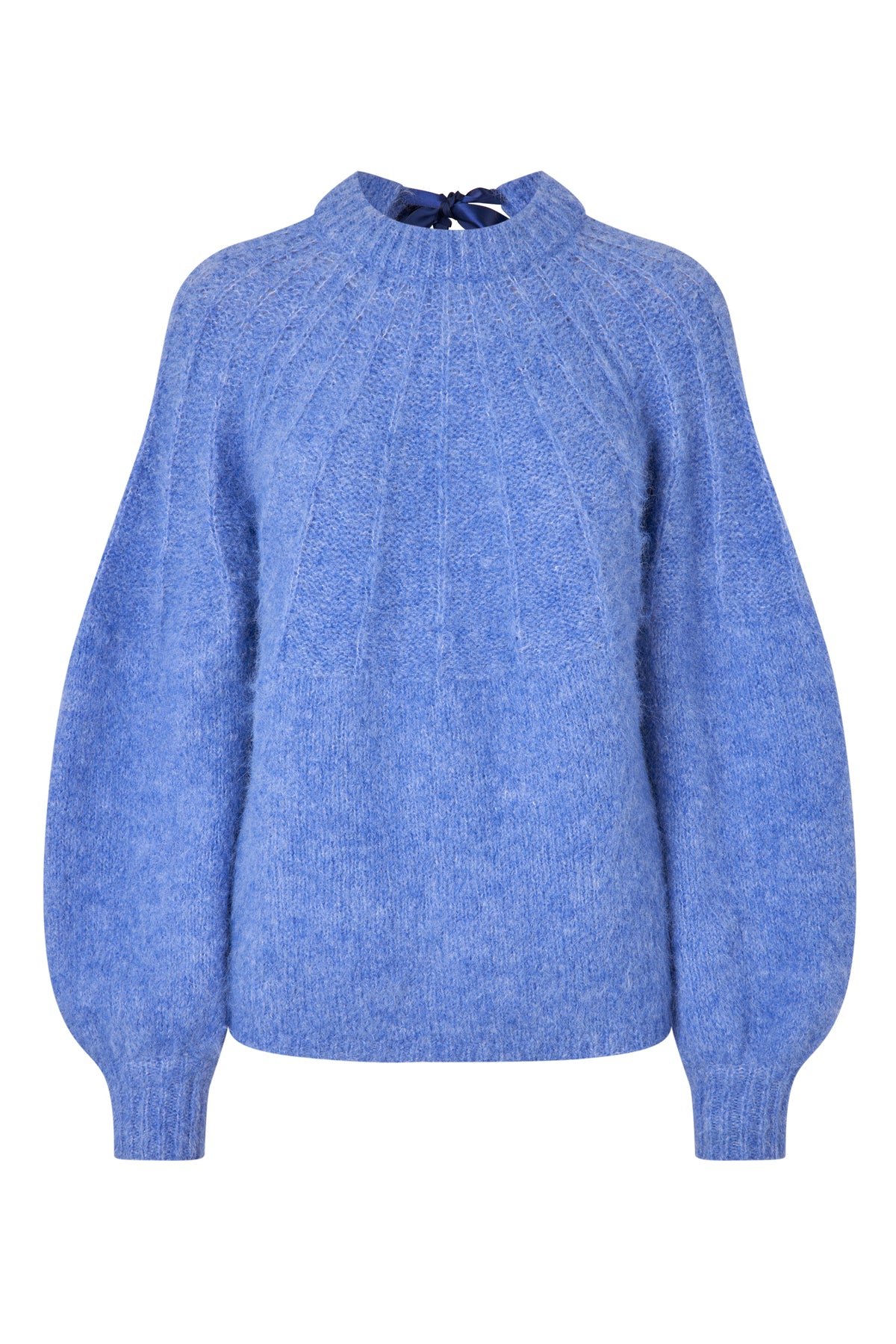 «Patrisia bow knit pullover» fra A-View. Lekker strikkegenser i nydelig blåfarge! Genseren har rund hals og ballongermer. Åpen rygg med knyting.