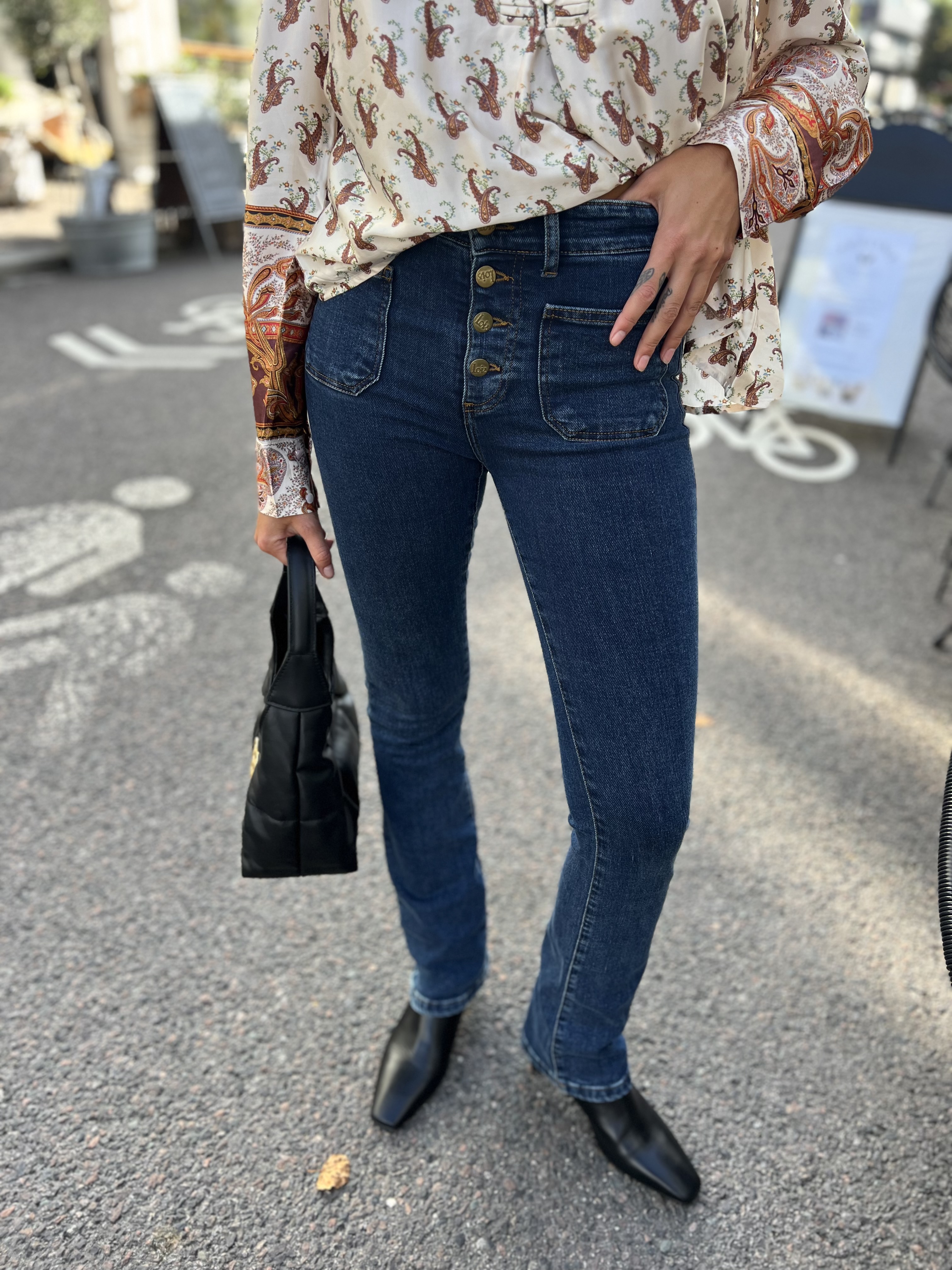 Stilfull buksemodell. Gaucho har en komfortabel utforming med høyt liv, beltehemper og god stretch. Buksen har smal sleng i bena og er ettersittende over rumpe og lår for en flatterende passform. Lommer foran og lommer bak. Lukkes med fire knapper i front.