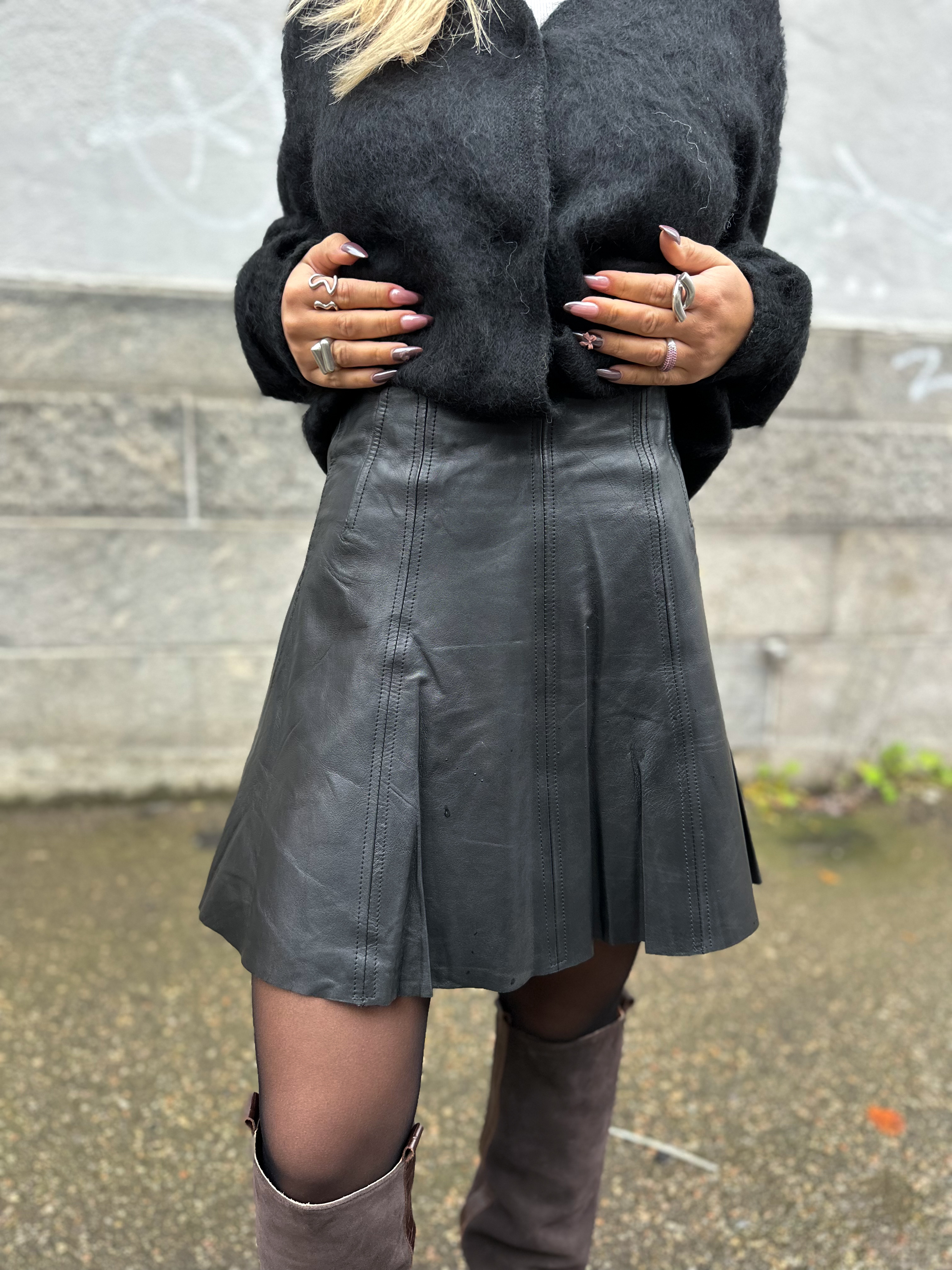 «Imla leather skirt» fra YAS. Et nydelig og mykt skinnskjørt. A - fasong med glidelås-lukking og knapp bak. Skjørtet er foret.