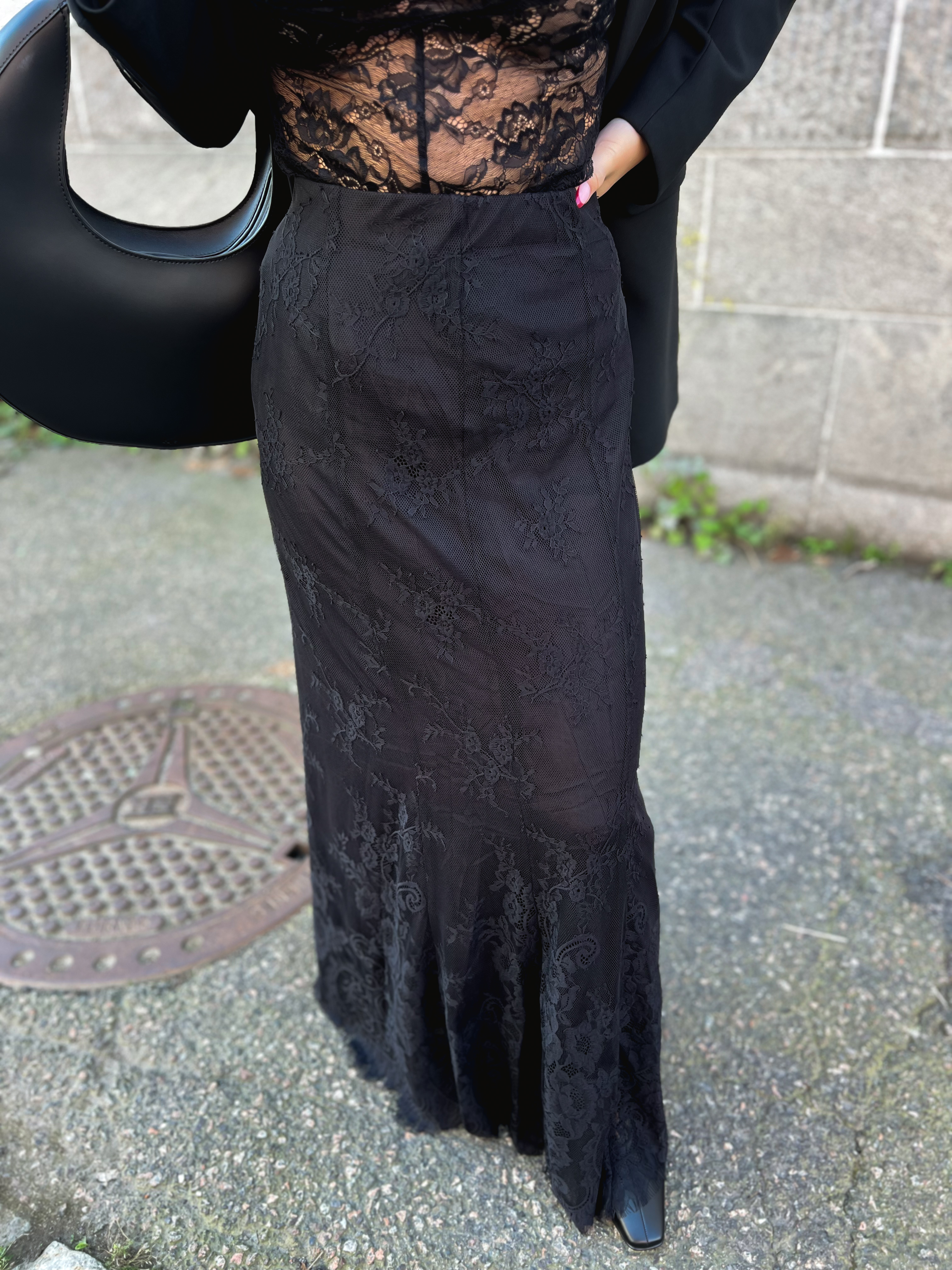 Skjørtet har en maxi lengde, er lav midje, har en figursydd kropp og utsvinget kant. Den har en skulpturell form og kan kombineres med en luksuriøs skjorte, myk strikkeplagg eller Lace Top for en total forhøyet look. Skjørtet lukkes i siden med glidelås.