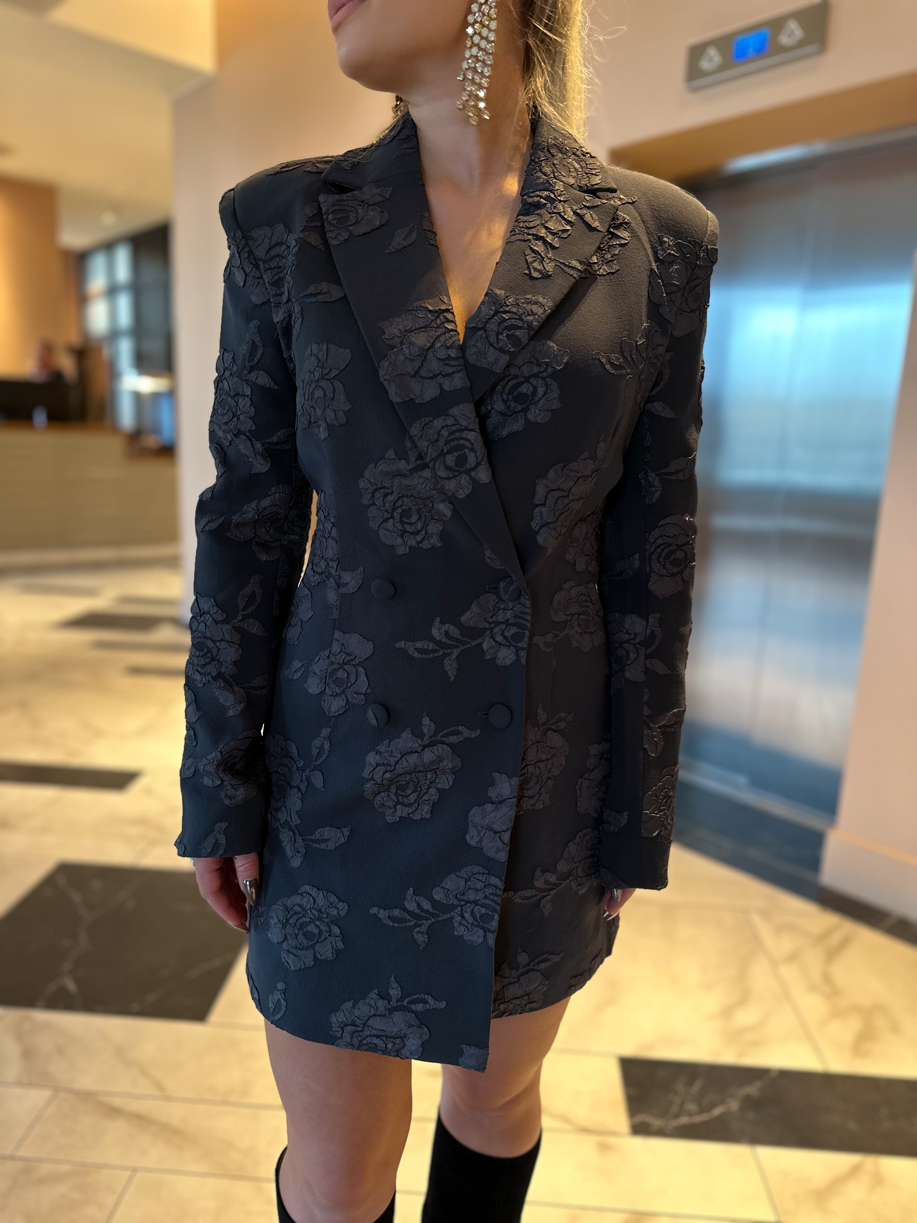 «3D flower blazer dress» fra Rotate er en rålekker kort blazez-kjole med lekkert blomsterprint. Kjolen har krage, lang erm og lukkes med knapper. Like fint å bruke som kjole eller style med bukse.