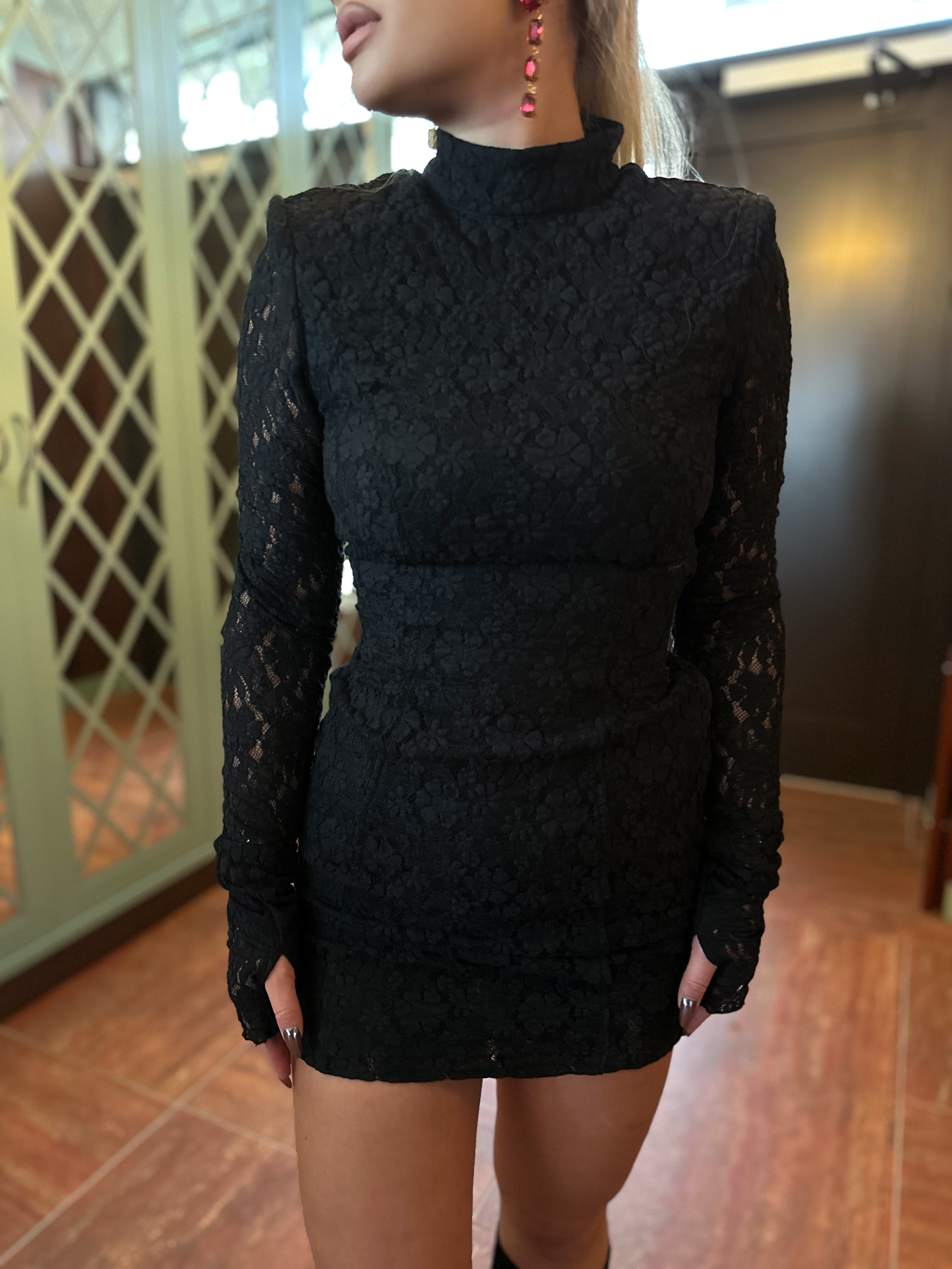 «Lace mini dress» fra Rotate er en lekker sort blondekjole med de fineste detaljene. Kjolen har åpen rygg med knyting og lukkes med skjult glidelås. Tettsittende i fasongen.