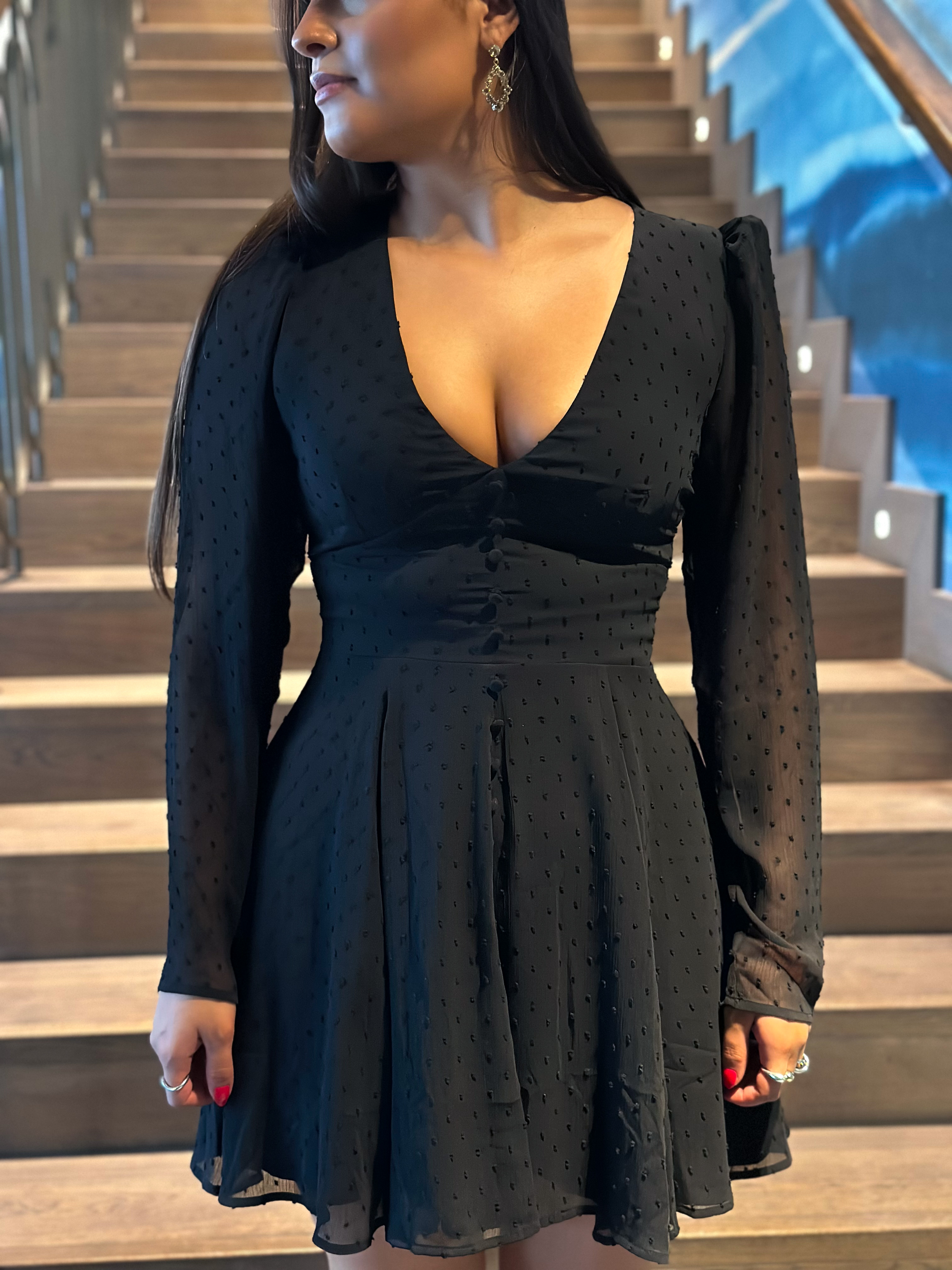 «Long sleeve mini dress» fra Rotate. Nydelig sort kjole med prikker. Kjolen har dyp v-hals og lang erm. Lukkes med knapper og glidelås bak. A-formet skjørt.