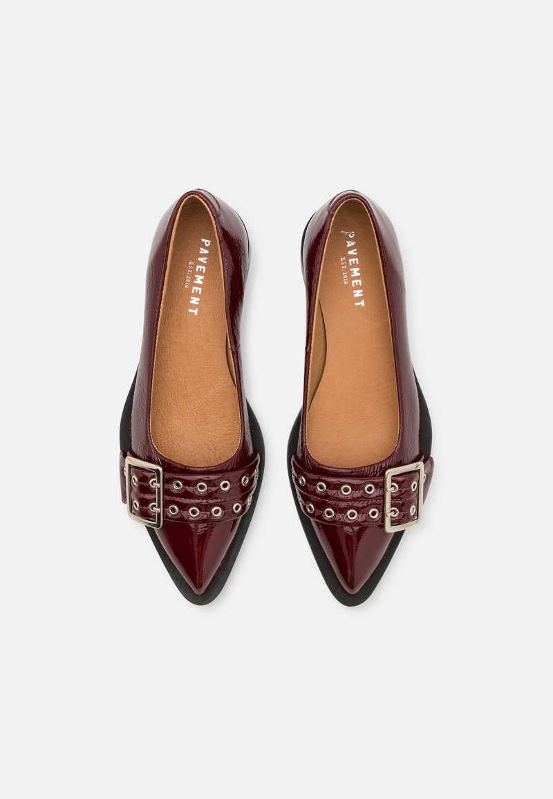 «Saso low» fra Pavement. Rålekre ballerinasko i vinrød lakk. Vi er ikke ferdig med ballerinasko - trenden er like stor denne våren og vi elsker det! Saso Low har spiss tå med en cool beltedetalj foran. Style skoene med et par baggy jeans eller en søt kjole.