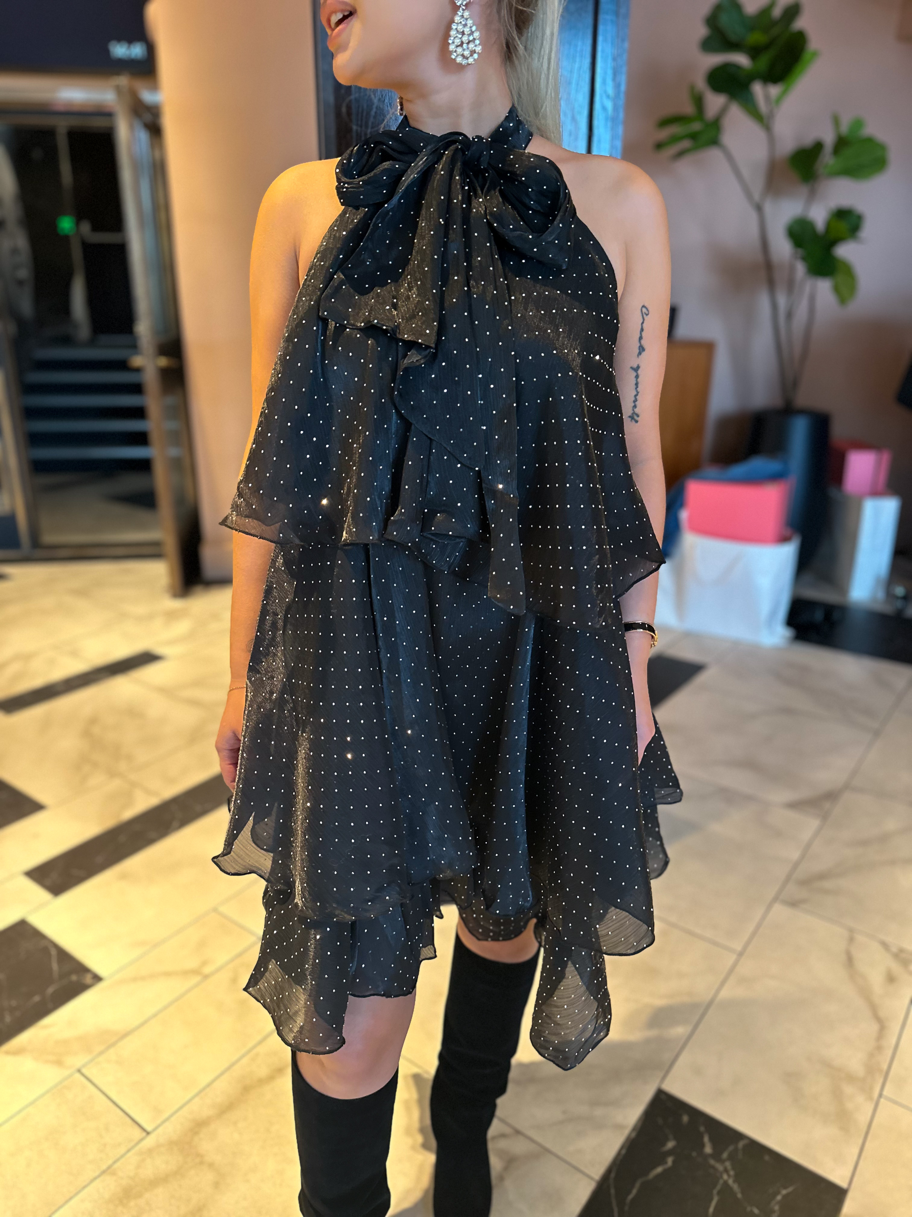 «Demi simili dress» fra A-View. Demi simili kjole er en midikjole i et skinnende materiale. Kjolen har overlappende lag, halterneck-utringning og knyting i halsen.