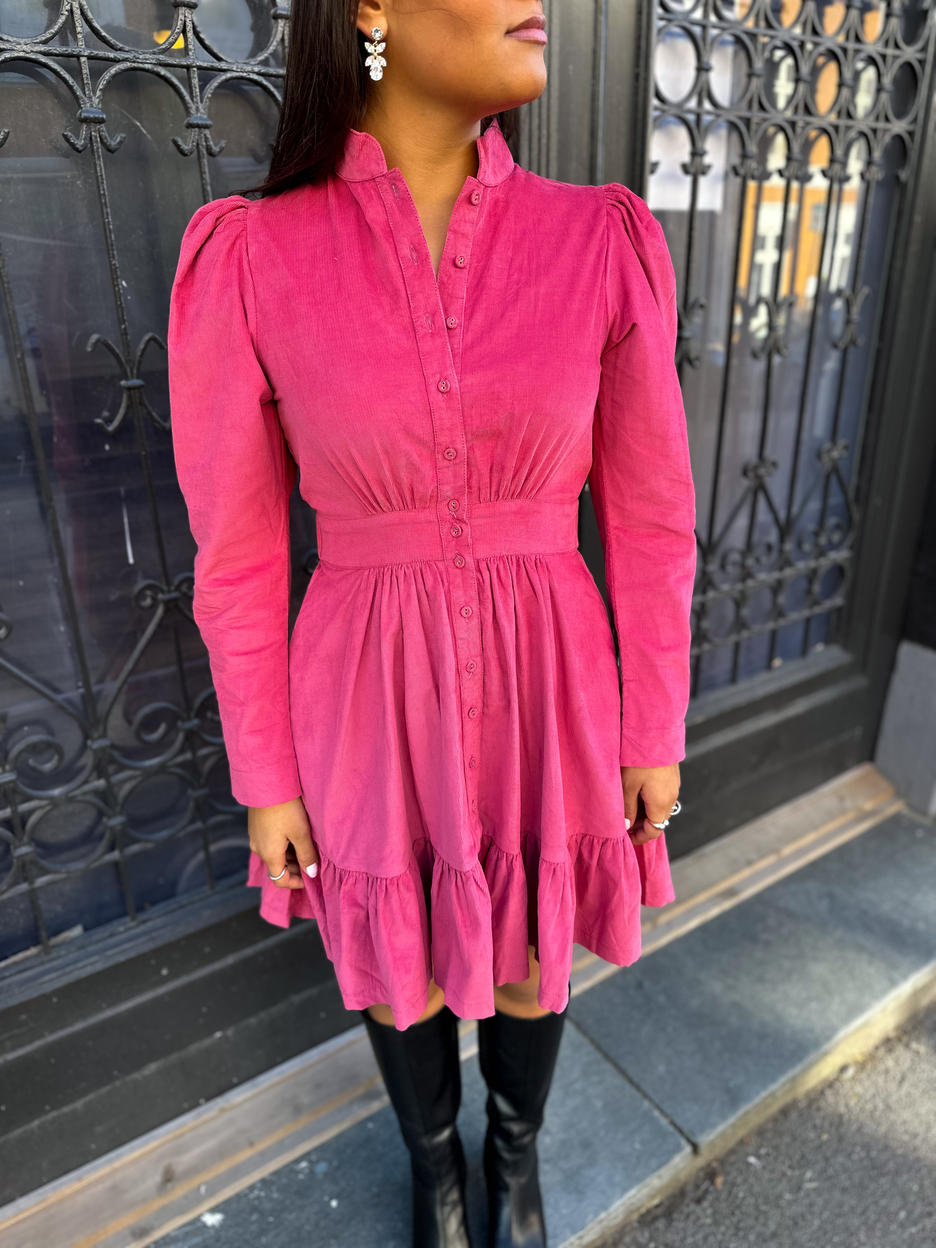 "Baby Cord Mini Dress" fra ByTimo. Superfin kjole i babycord-kvalitet. Kjolen har rund hals, ballongermer og smal puff over skuldrene. Markert liv med bredt belte i midjen med elastisk strikk bak. Utsvingt skjørt med a-shape og kappe nederst. Kjolen har fine broderier over bryst og ermer. Lukkes med skjult glidelås i siden. Stikklommer i sidene. Minikjole med lengde til ca midt på låret.