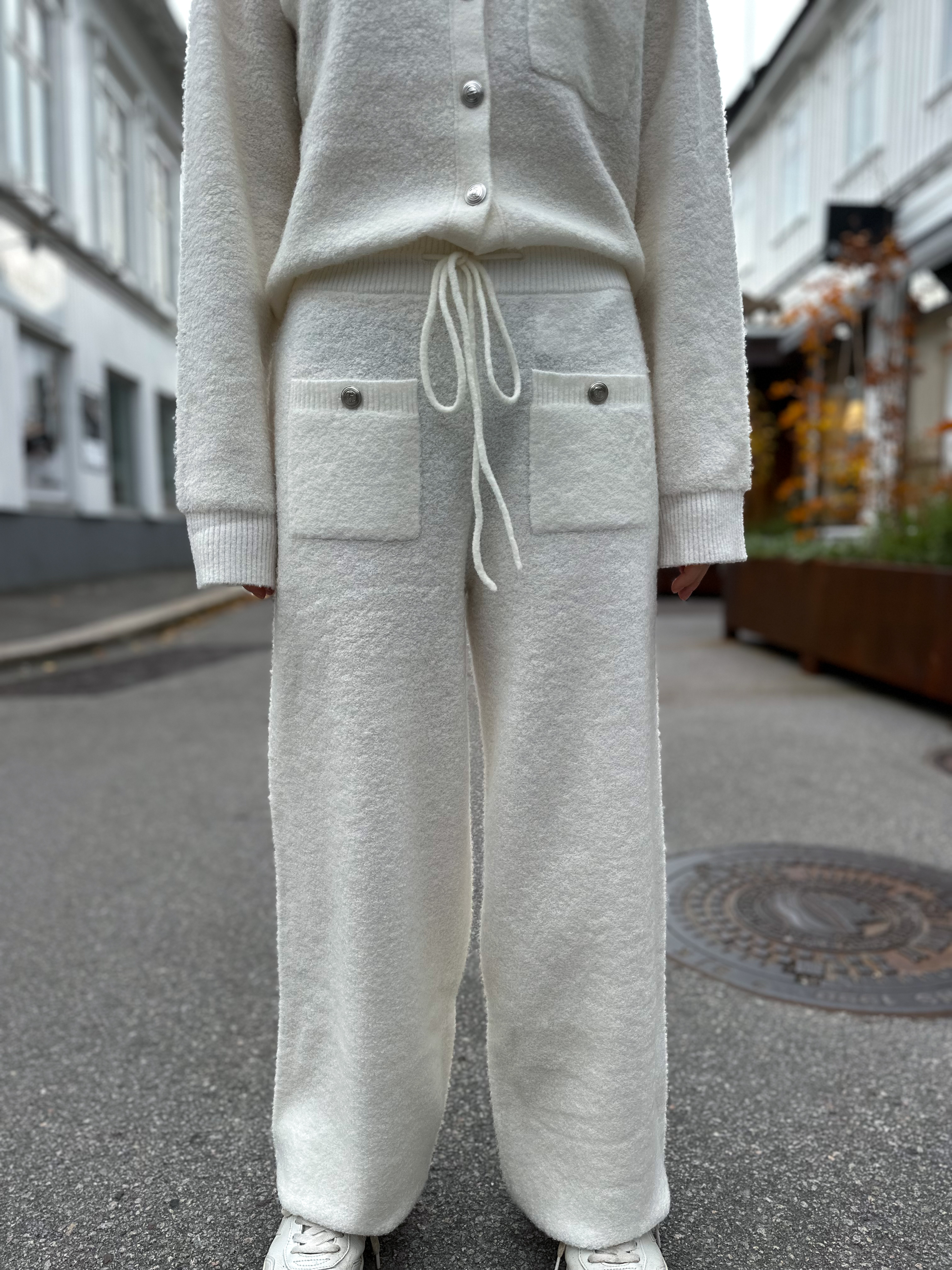 Sankt Moritz Knitted Trousers - Snow White - er en super fin bukse med ballong ben i nydelig boucle kvalitet. Med snøring i midjen er de ideelle for avslappet loungewear. Disse buksene kombinerer komfort og stil, og gir deg et perfekt alternativ for koselige dager hjemme eller avslappende kvelder.