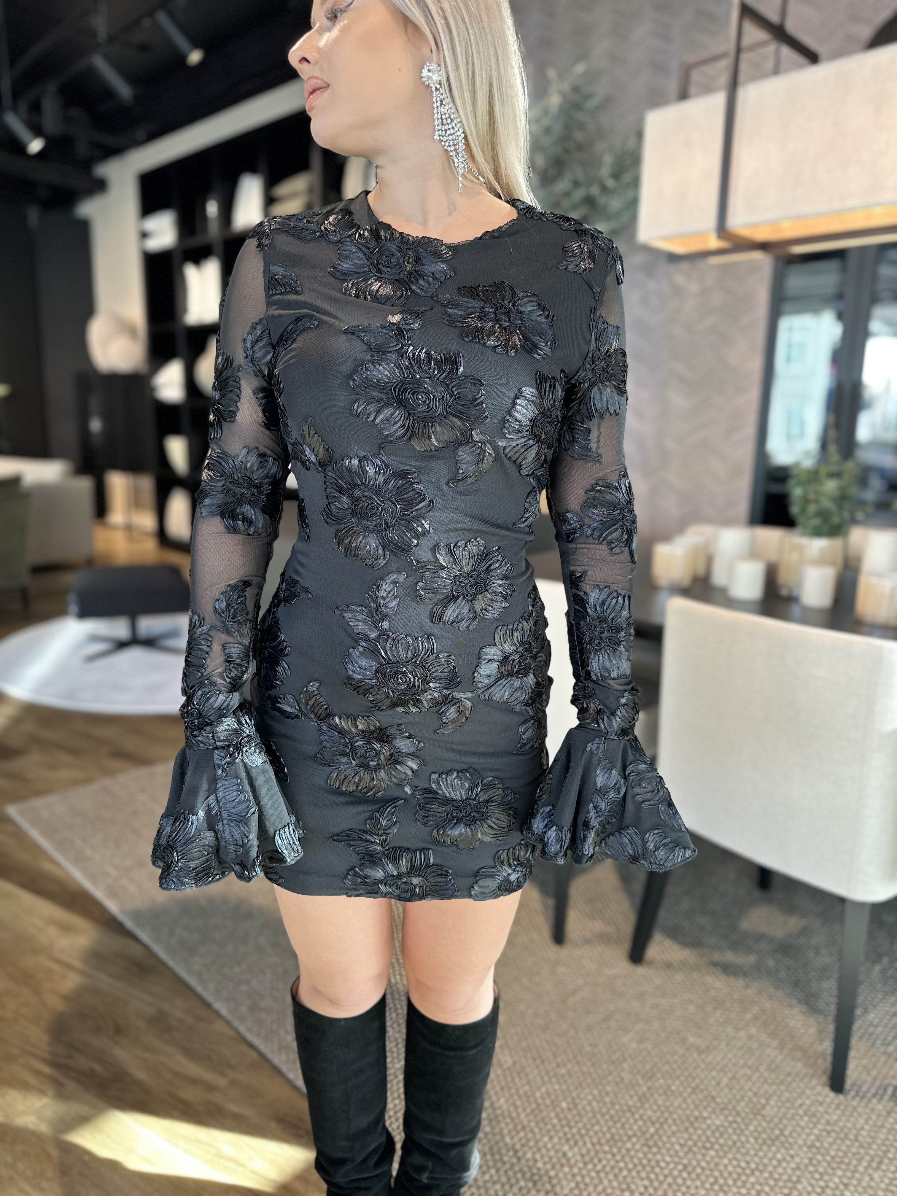 Flower Mesh Mini Dress fra ROTATE Birger Christensen. Vakker minikjole fra ROTATE med ton-i-ton blomster. Flower Mesh Mini Dress har lange, smale ermer med lang, utsvingt mansjett. Kjolen har kort lengde og kroppsnær silhuett. Knappelukking i nakken og åpen i ryggen.