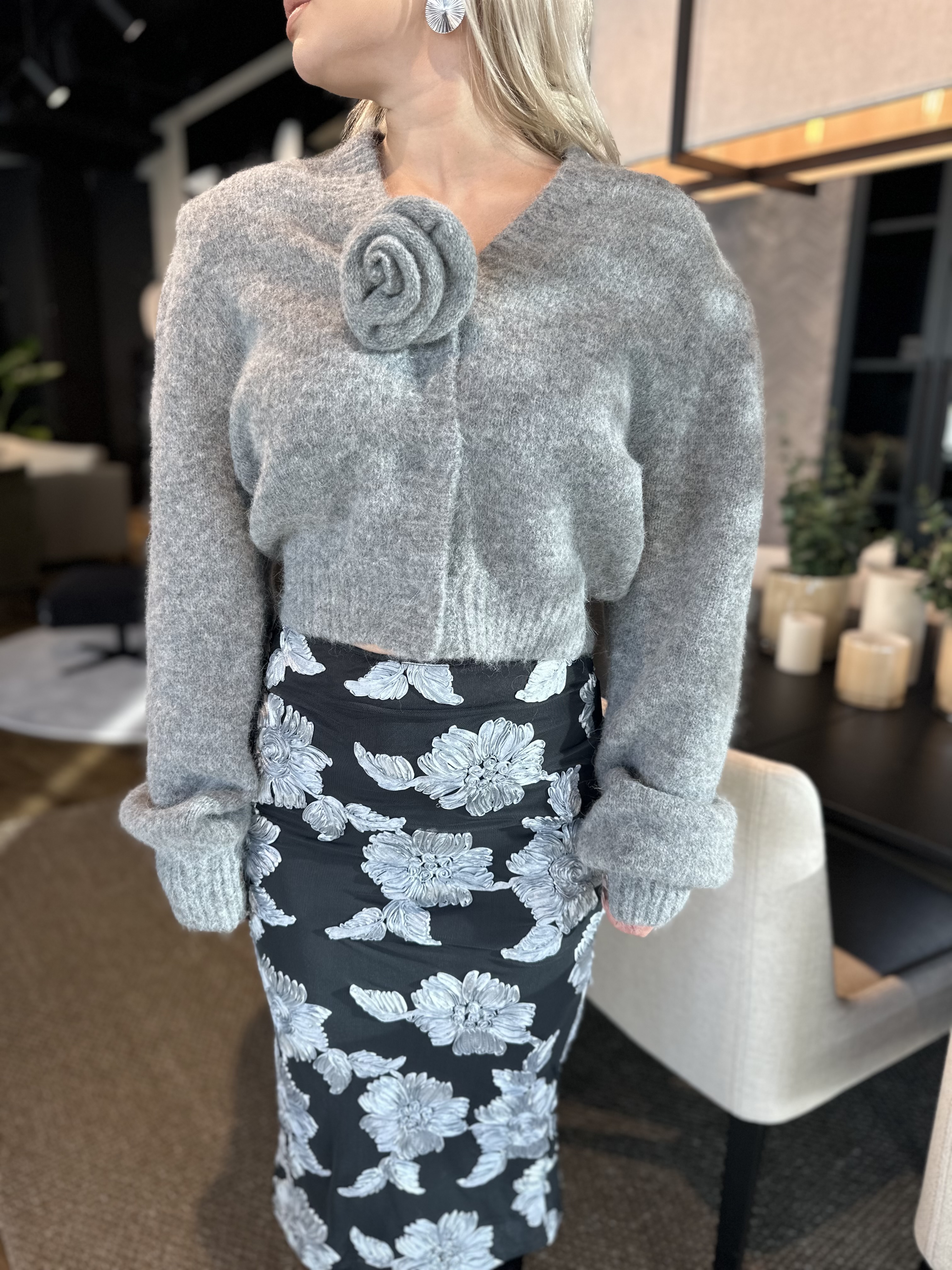 "Knit cropped cardigan" fra Rotate har en avslappet passform med lange ermer. Den har V-hals og en enkel dekorativ rosettknapp foran. Laget av mykt og fluffy strikket materiale, gir den både varme og stil. Perfekt for lag-på-lag!