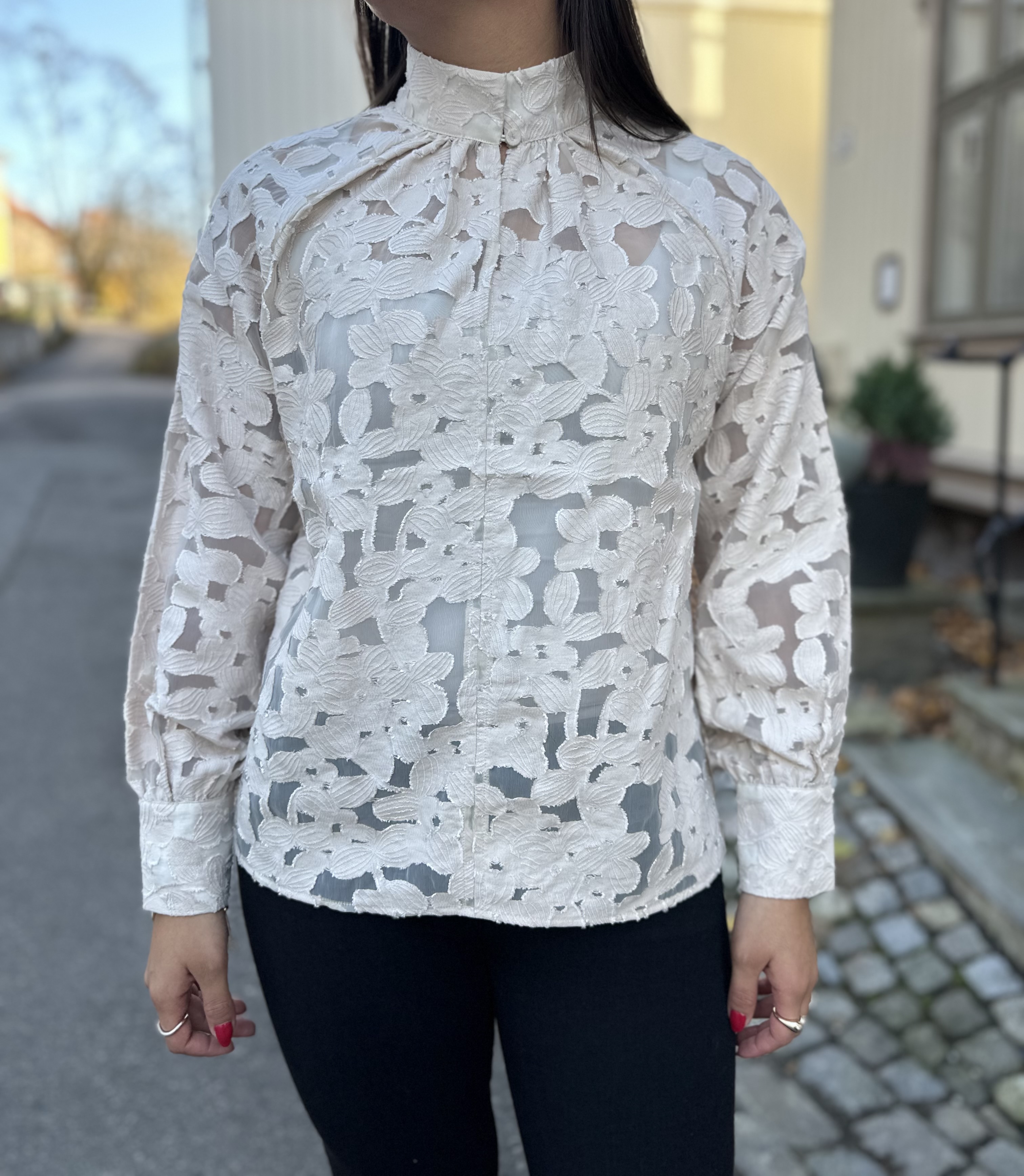 Stary Blouse er nn elegant bluse fra Second Female. Stary Blouse har semi-transparent stoff med vakkert brodert blomstermønster. Blusen har brede mansjetter og høy hals som lukkes med en diskret knapp. En perfekt bluse til spesielle anledninger eller for en pyntet hverdagslook.