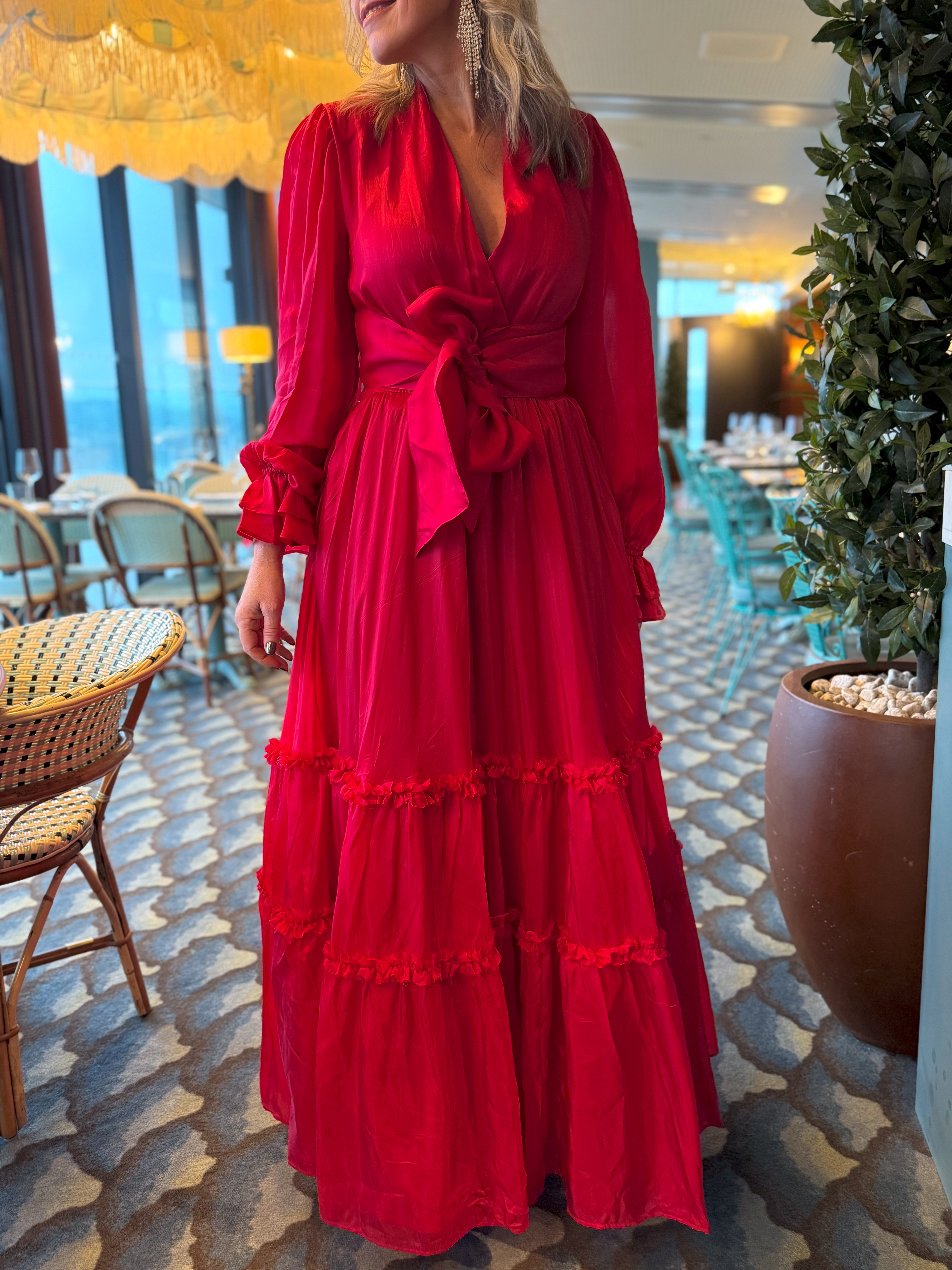 Denne lange, røde skjønnheten er laget i elegant viskose og designet med voluminøse volanger i skjørtet, som får ekstra dybde fra lag av organza. Med elastisk midje, et avtagbart belte og lommer er Red Hot Senorita Dress både komfortabel og glamorøs – perfekt for julefesten og andre store øyeblikk!