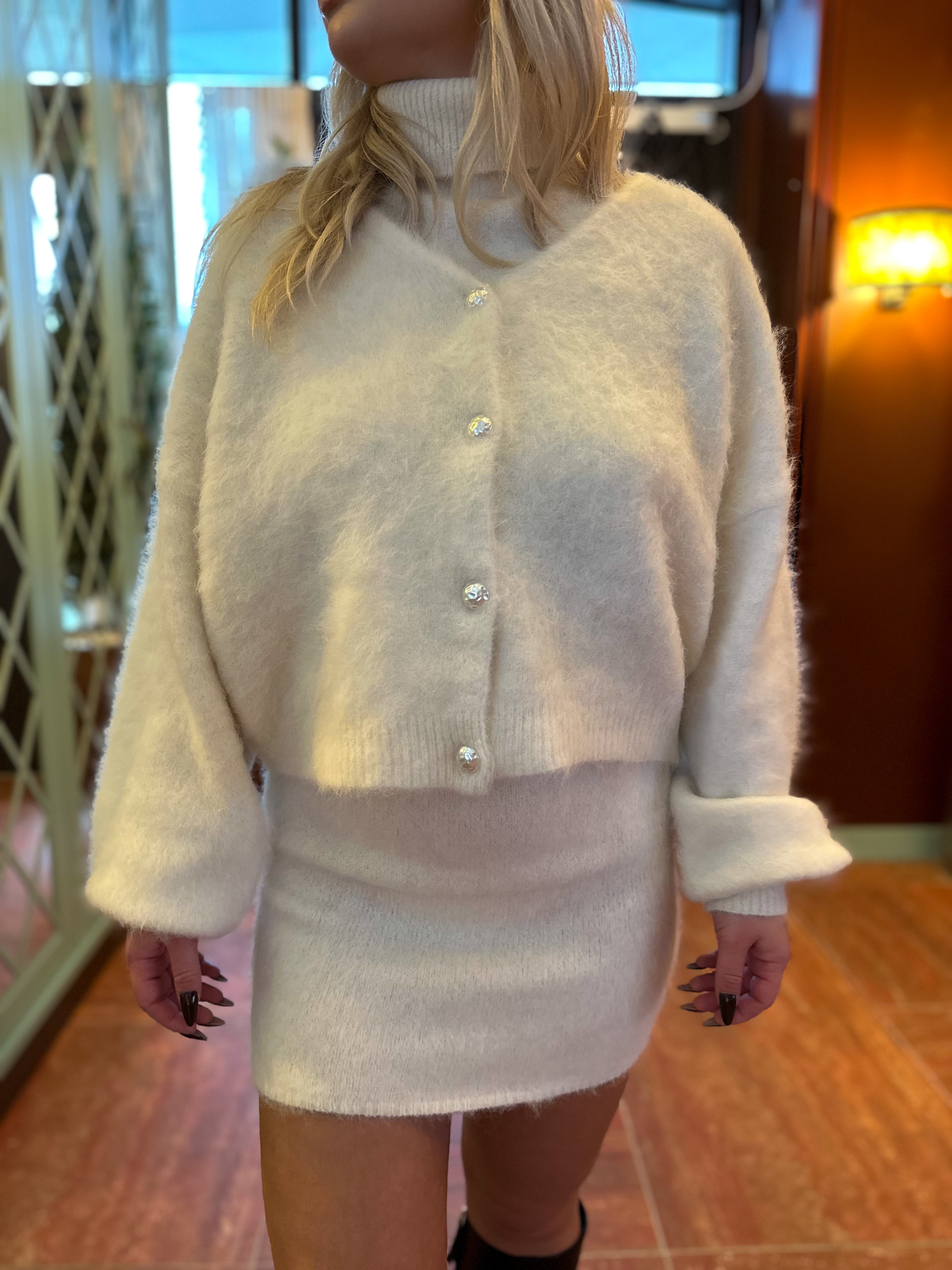 "Sana Cardigan" er en nydelig cardigan med pusete overflate og dekorative perleknapper. Den har v-hals, lange ermer og en løs passform.