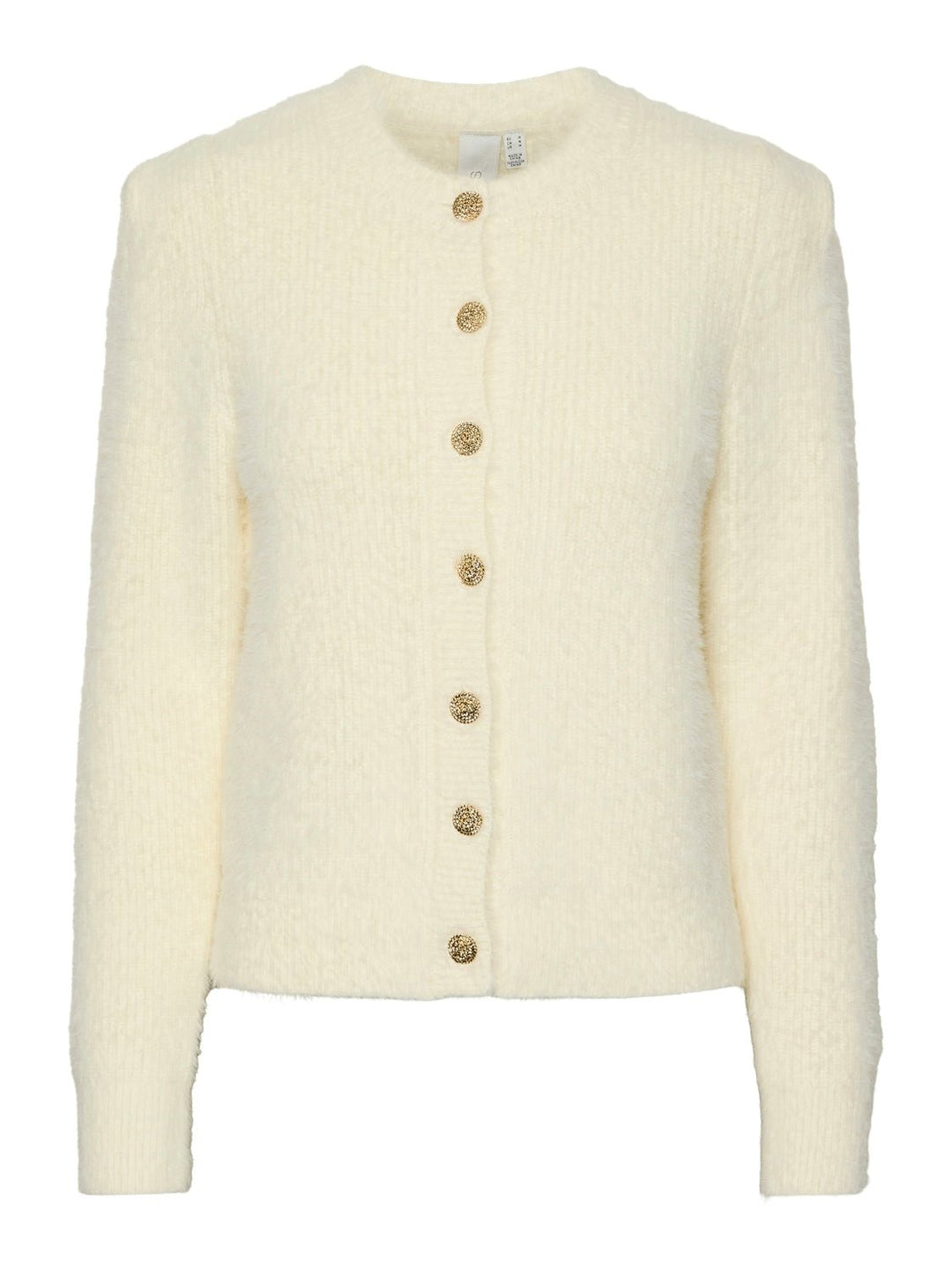 "Mey Knit Cardigan" fra YAS, nydelig cardigan i fuskestoff. Super deilig, med vakre gullknapper og puffdetalj på skulderene.