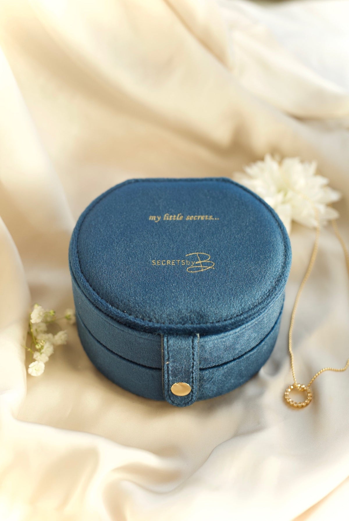 "My little Secrets smykkeskrin to etasjer" fra det norske merke Secrets By B. Praktisk og nydelig resisesmykkeskrin. Vakker velour med teksten “my little secret`s” i gull. Smykkeskrinet har to lag med god plass til alle dine smykker.