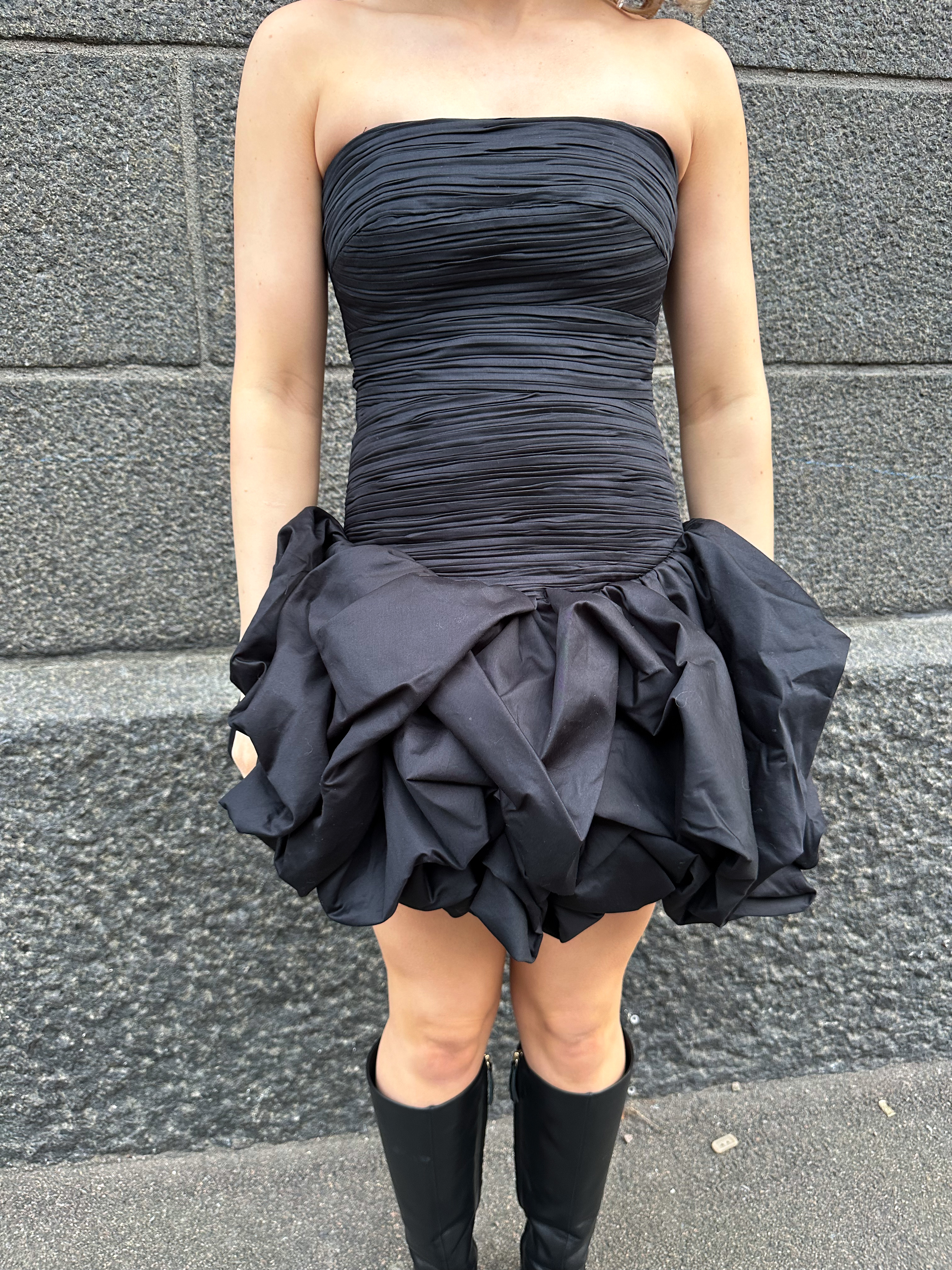 "Violette Bubble Hem Mini Dress" fra Aje. Vakker minikjole fra Aje i klassisk sort. Violette Bubble Hem Mini Dress er stroppeløs med en rynket, figursydd overdel. Kjolen har et voluminøst miniskjørt med folder.
