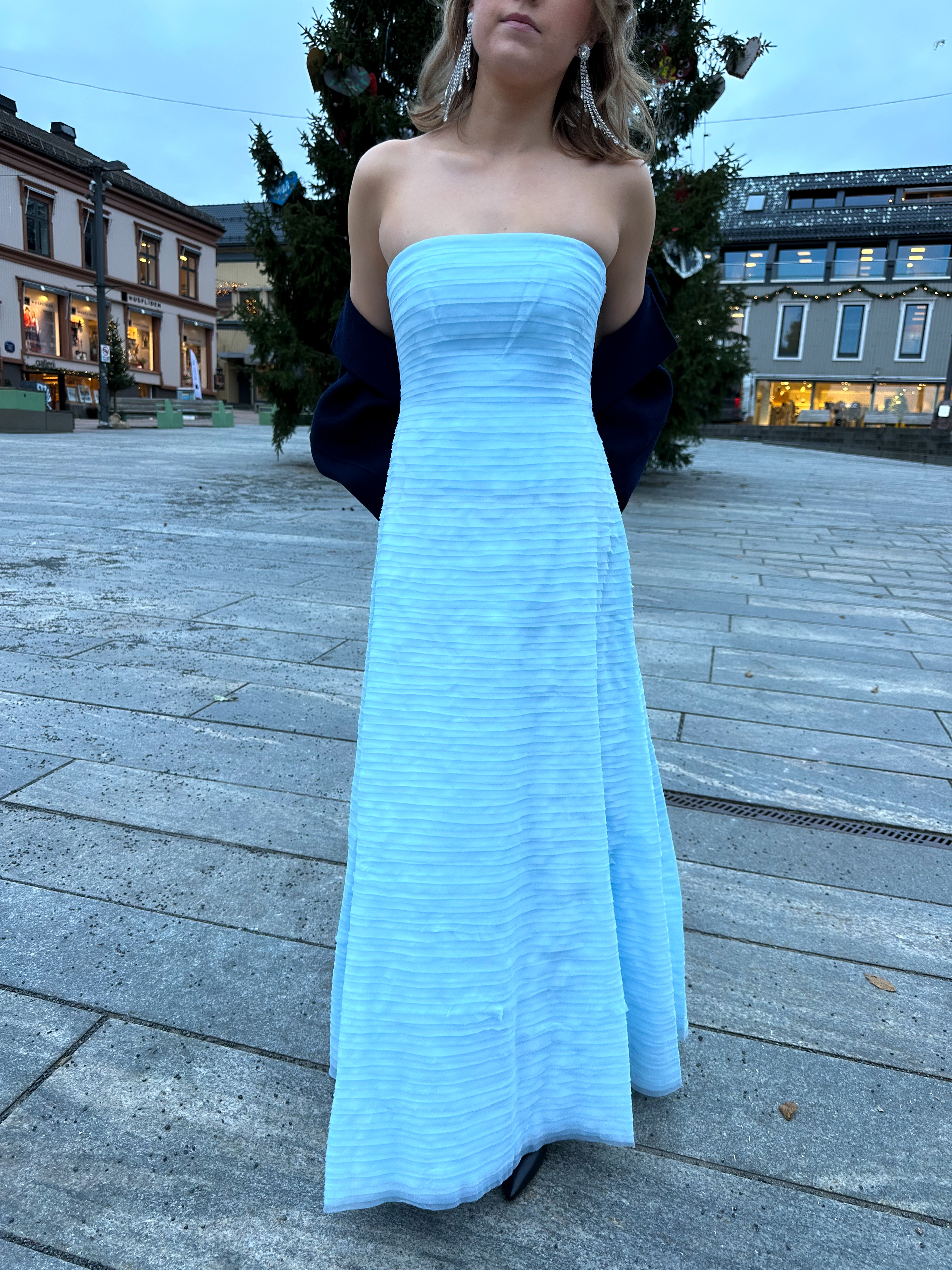 "Soundscape Maxi Dress" fra Aje. Vakker maxikjole fra Aje med lys blå rysjer i organza. Soundscape Maxi Dress er stroppeløs med smal, passform og innvendige spiler. Kjolen har skjult glidelås i ryggen og maxiskjørt med volum.