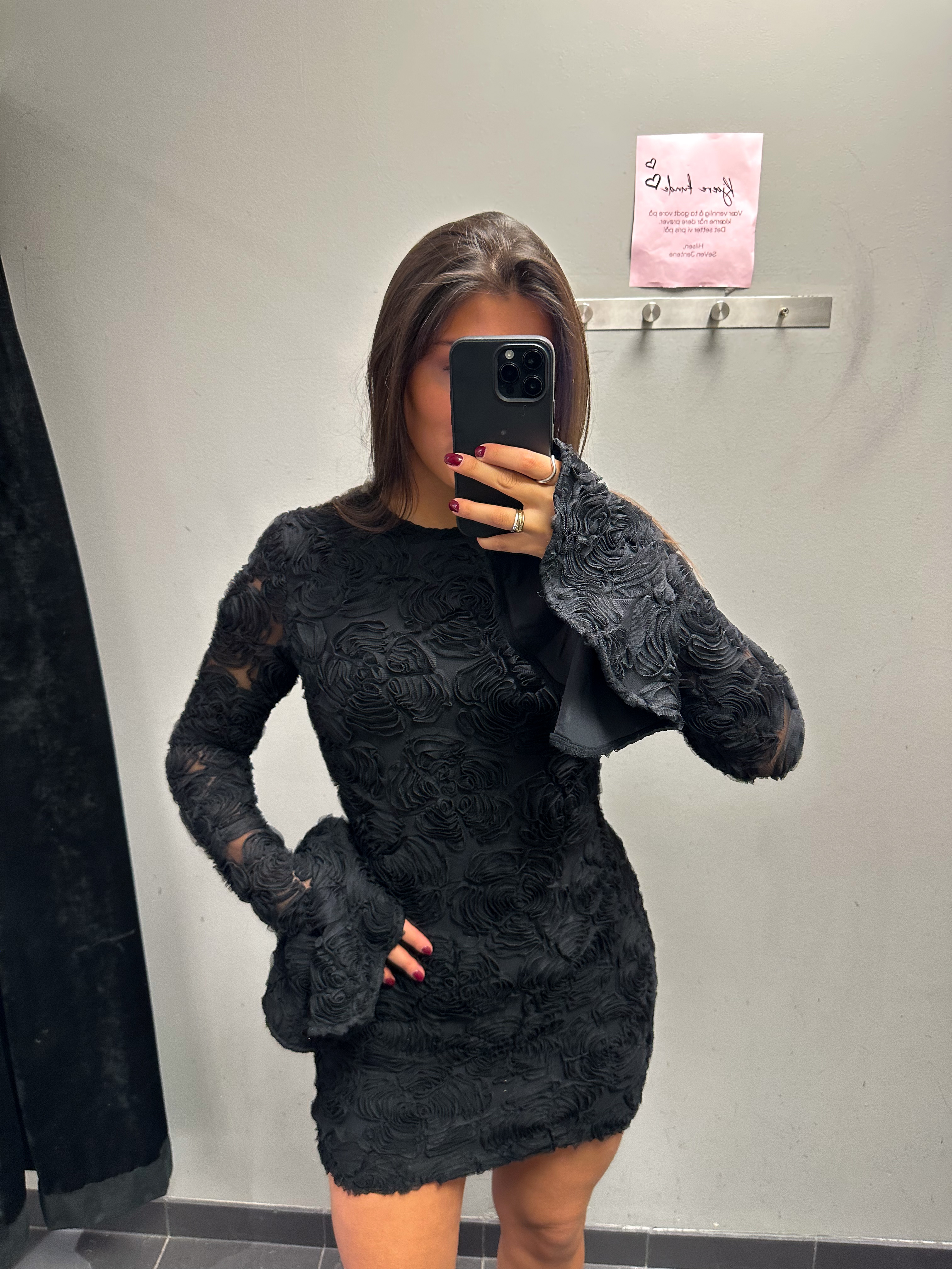 "Flower Mesh Mini Dress" fra ROTATE Birger Christensen. Vakker minikjole fra ROTATE med ton-i-ton blomster. Flower Mesh Mini Dress har lange, smale ermer med lang, utsvingt mansjett. Kjolen har kort lengde og kroppsnær silhuett. Knappelukking i nakken og åpen i ryggen.