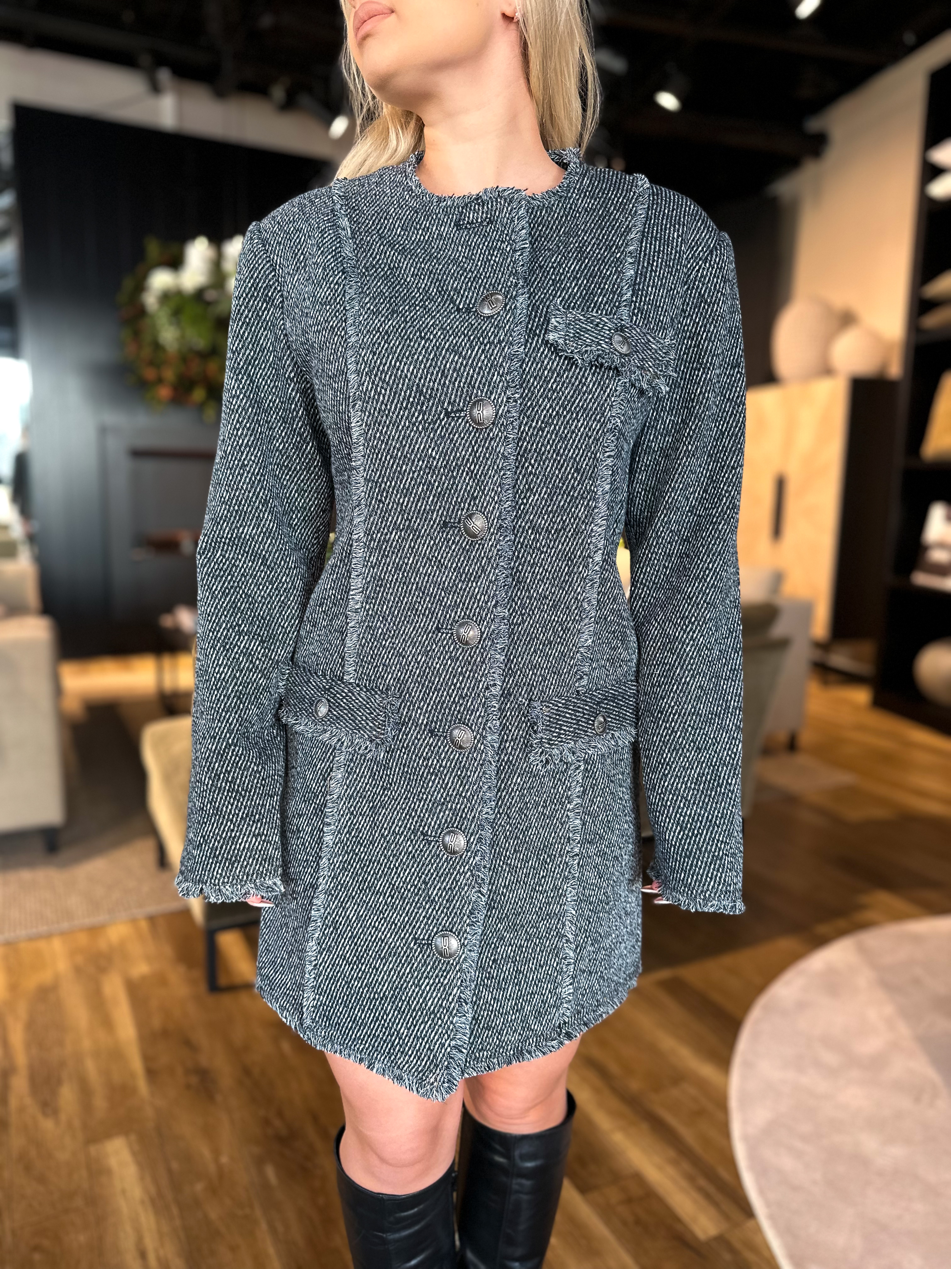 «Belma Dress» fra Gestuz er en elegant og klassisk kjole tweedkvalitet. Kjolen er perfekt til hverdag og fest Kjolen er ettersittende og lukkes med lekre sølv-knapper.