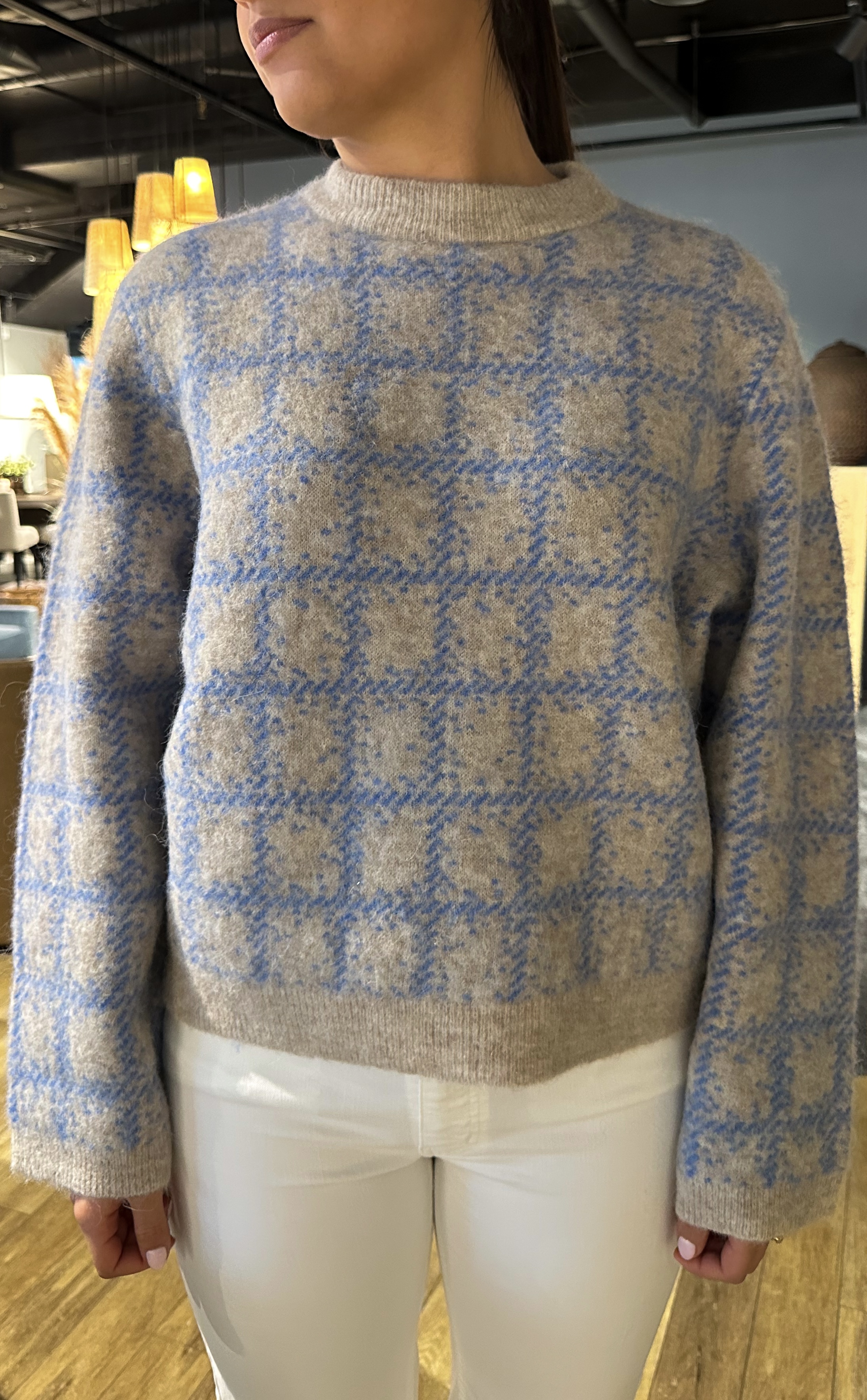 "Lugano Knit O-neck" fra Second Female. Myk og stretchy genser i alpakka-ullblanding med helstrikket mønster. Rund hals og lange, vide ermer. Løs passform for komfort og stil.