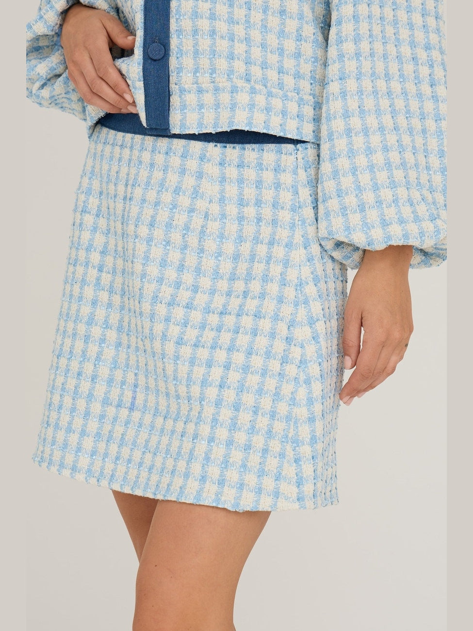 "Liberta Skirt" er et miniskjørt med lyseblå og hvite ruter, laget av et strukturert materiale. Skjørtet har en glidelås i siden, som gir et rent og sofistikert utseende. Skjørtet er normal i størrelsen.