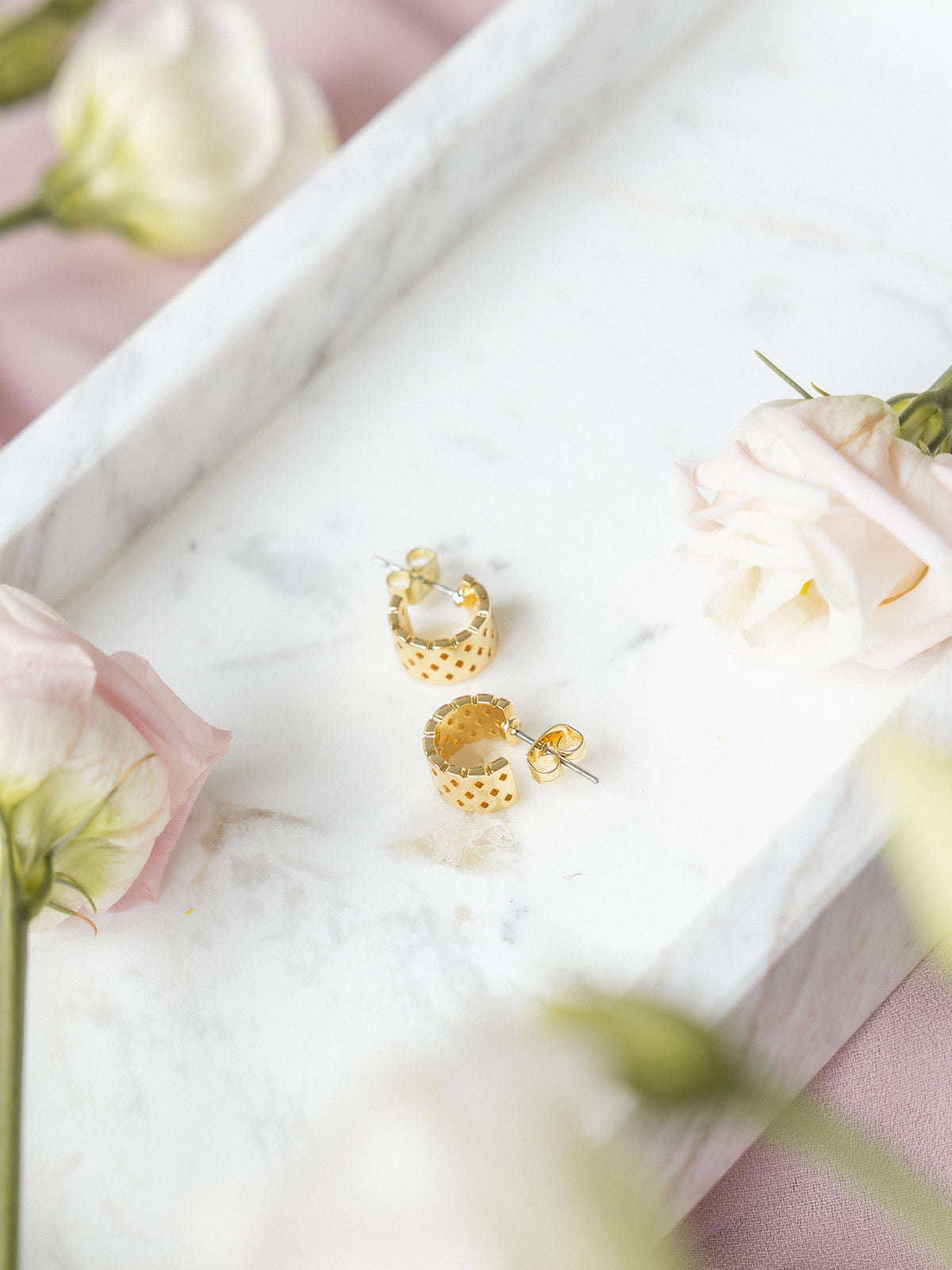 Disse søte og minimalistiske øredobbene i glansfullt gull er det ideelle tilbehøret for enhver anledning. Den perfekte gaven når du ønsker å gi noe tidløst og elegant.