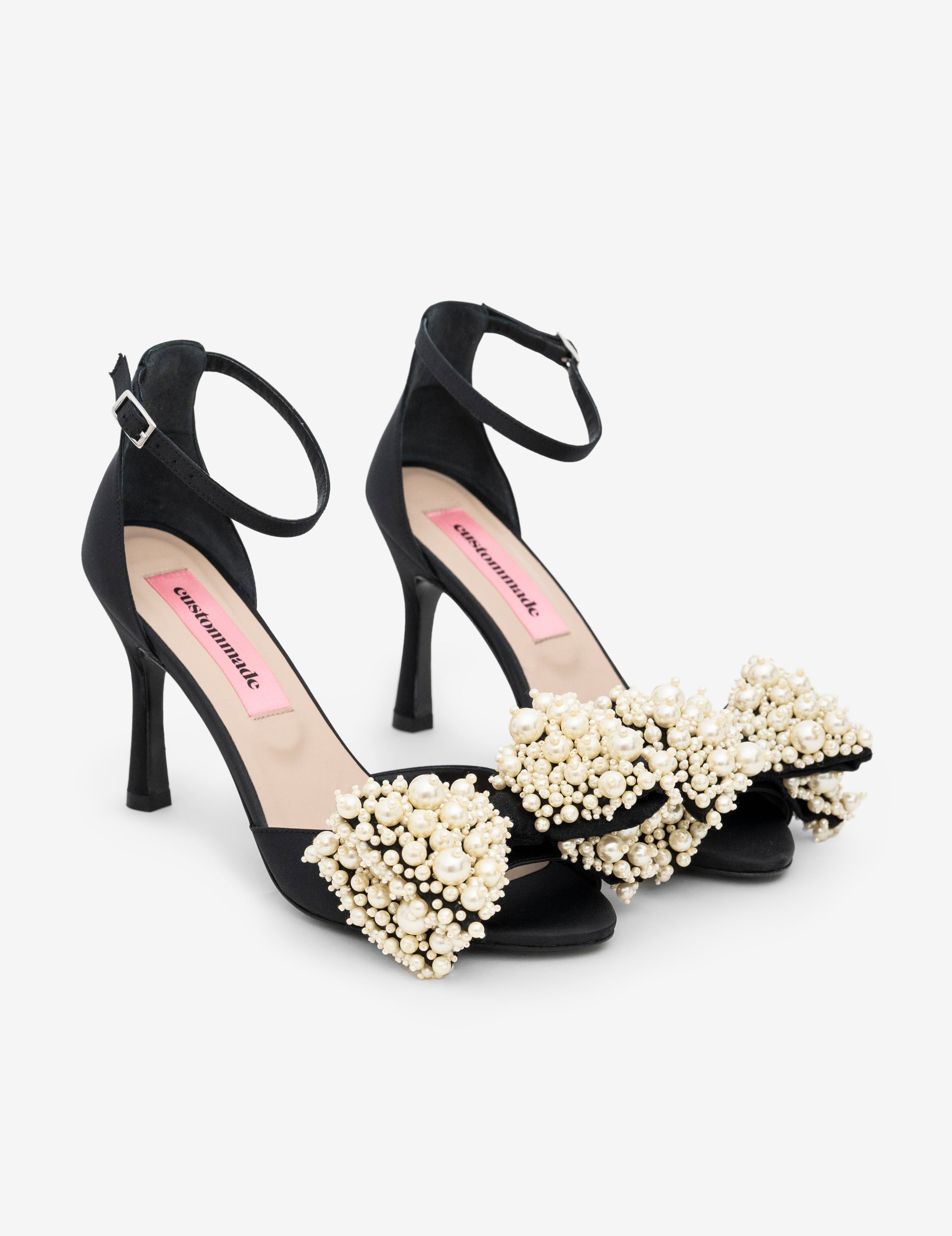 ICONIC Pearl Bow Sandal er en elegant stilett med tidløs design. Laget i luksuriøst sateng, har den en vakker håndbrodert perlesløyfe på toppen, som gir et unikt preg. Sandalen har åpen tå og en justerbar ankelstropp for en komfortabel og sikker passform. Perfekt for spesielle anledninger eller en kveld ute, kombinerer den stil og komfort på en sofistikert måte.