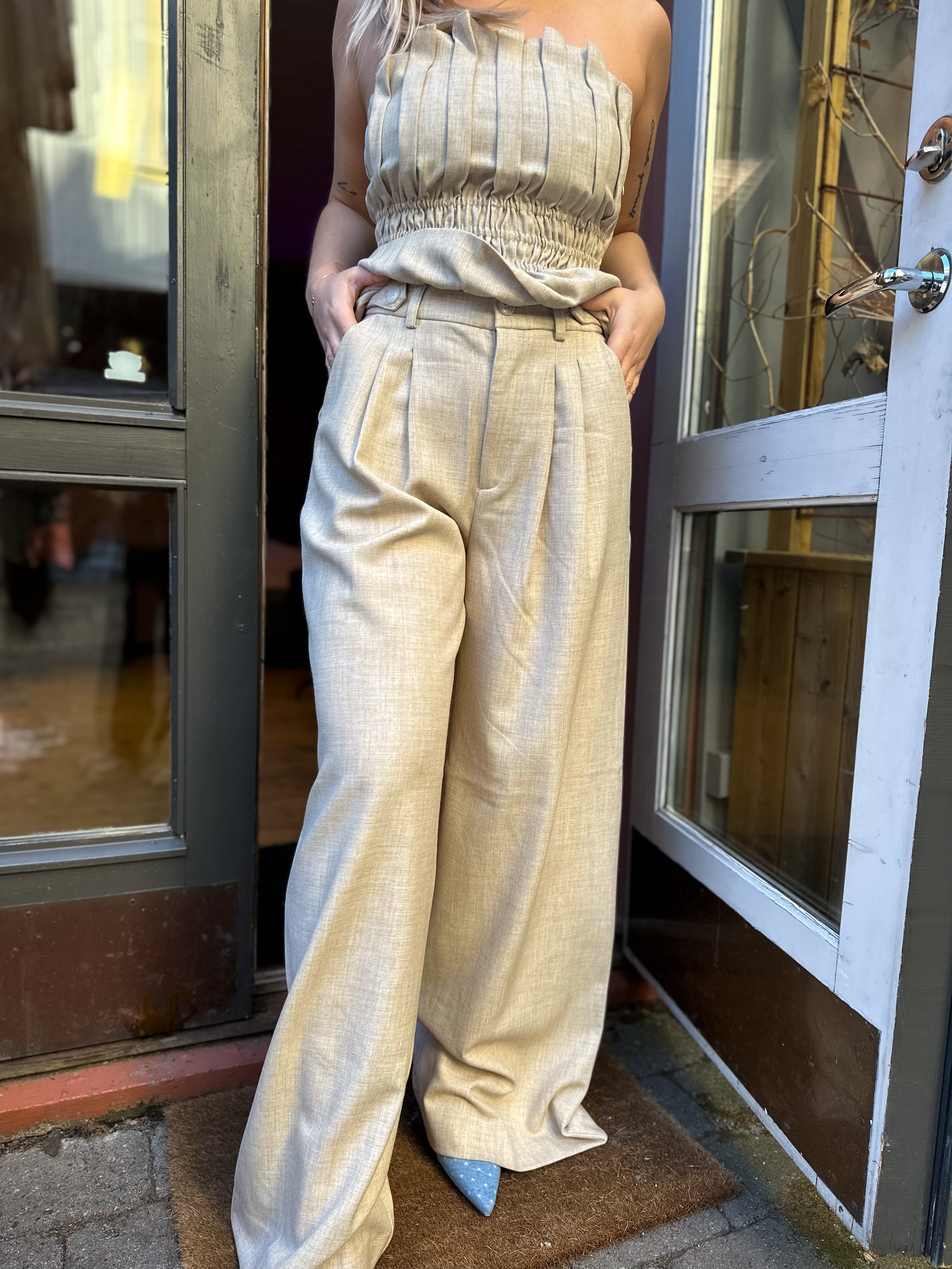 "Decy Trousers" fra Gestuz er en superfin dressbukse fra Gestuz i delikat beigetone! Decy Pants har lange, vide ben og høyt liv. Praktiske lommer i sidene. Buksen er også laget i en deilig kvalitet med stretch som føles superdeilig på. Kombiner med tilhørende topp for en stilrent sett, eller kombiner til andre overdeler. Et must-have denne sesongen!