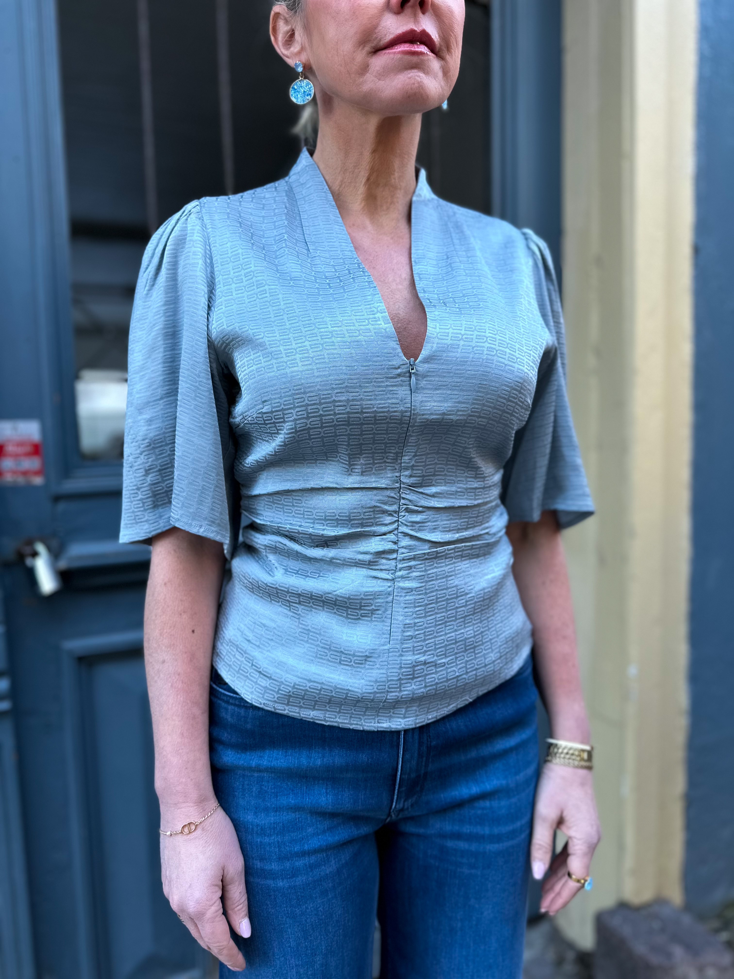 "Bianca Blouse -Grey blue" fra Gestuz. Lekker topp fra Gestuz med v-hals og halvlange ermer. Toppen har drapert look i midjen.