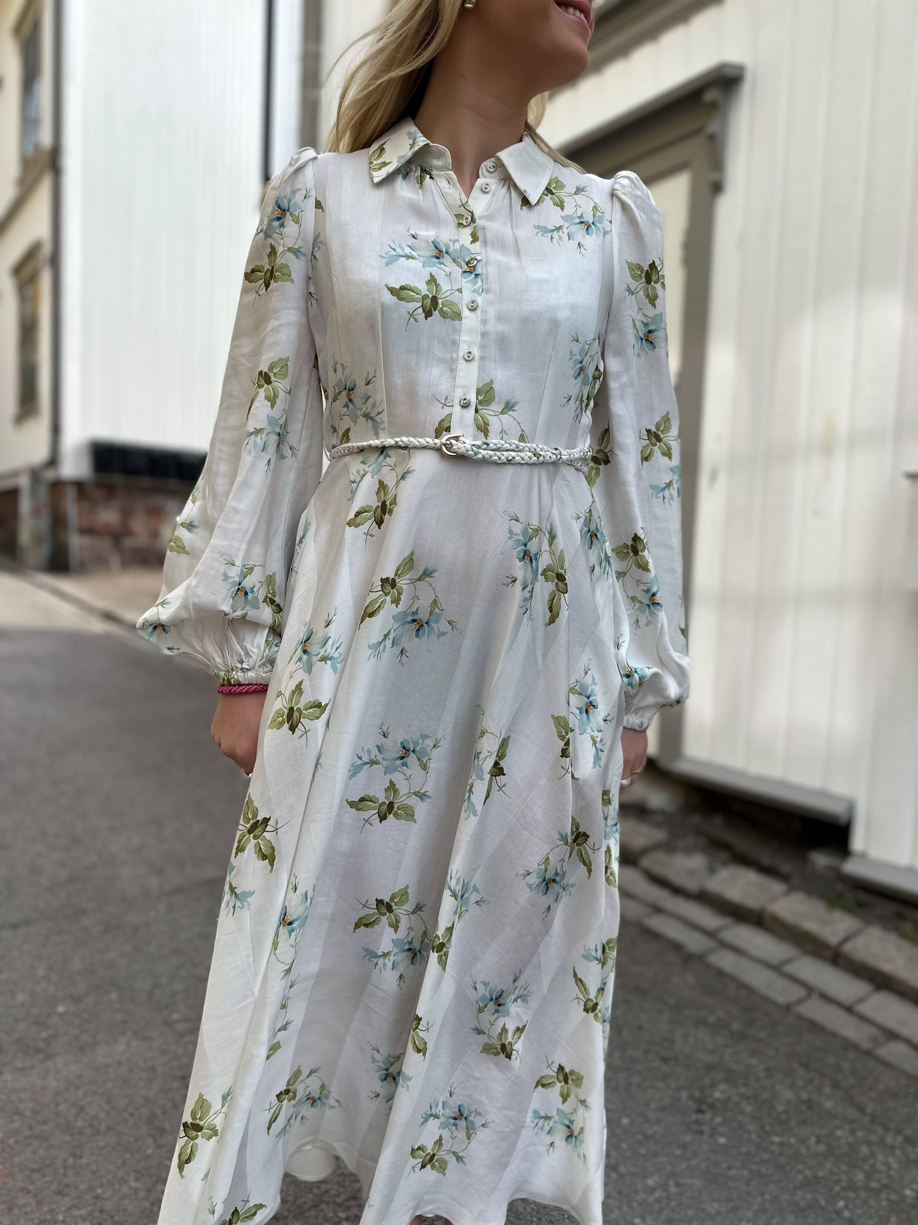 "Viscose Shirt Dress" fra byTiMo. Nydelig midi kjole med a-formet skjørt og lange ballong ermer. Kjolen har en vakker krage og ett løst avtagbart belte.