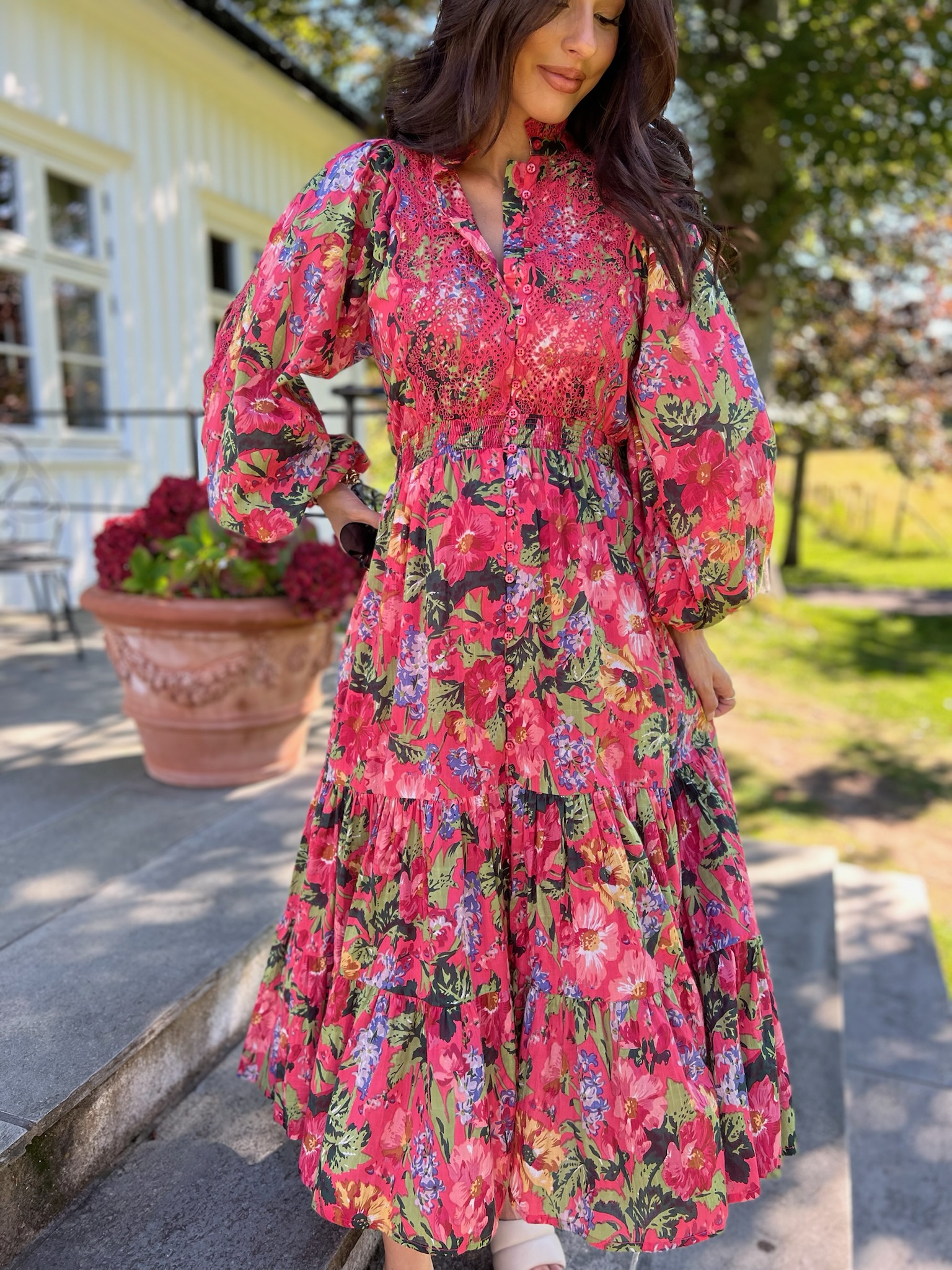 "Cotton Slub Midi Dress" fra byTiMo. En nydelig midikjole fra byTiMo. Cotton Slub Midi Dress er kuttet i byTiMos lette og myke bomull- og viskoseblanding med slubdetaljer i stoffet. Den har en minilengde og definert, smocket midje. Kjolen har oversizede, vintage-inspirerte, korte ermer og er satt inn med broderie anglaise detaljer på brystet, ermene, mansjettene og halsen. Cotton Slub Midi Dress har et elegant midiskjørt med volum, knappelukking i front og knytebelte i livet.